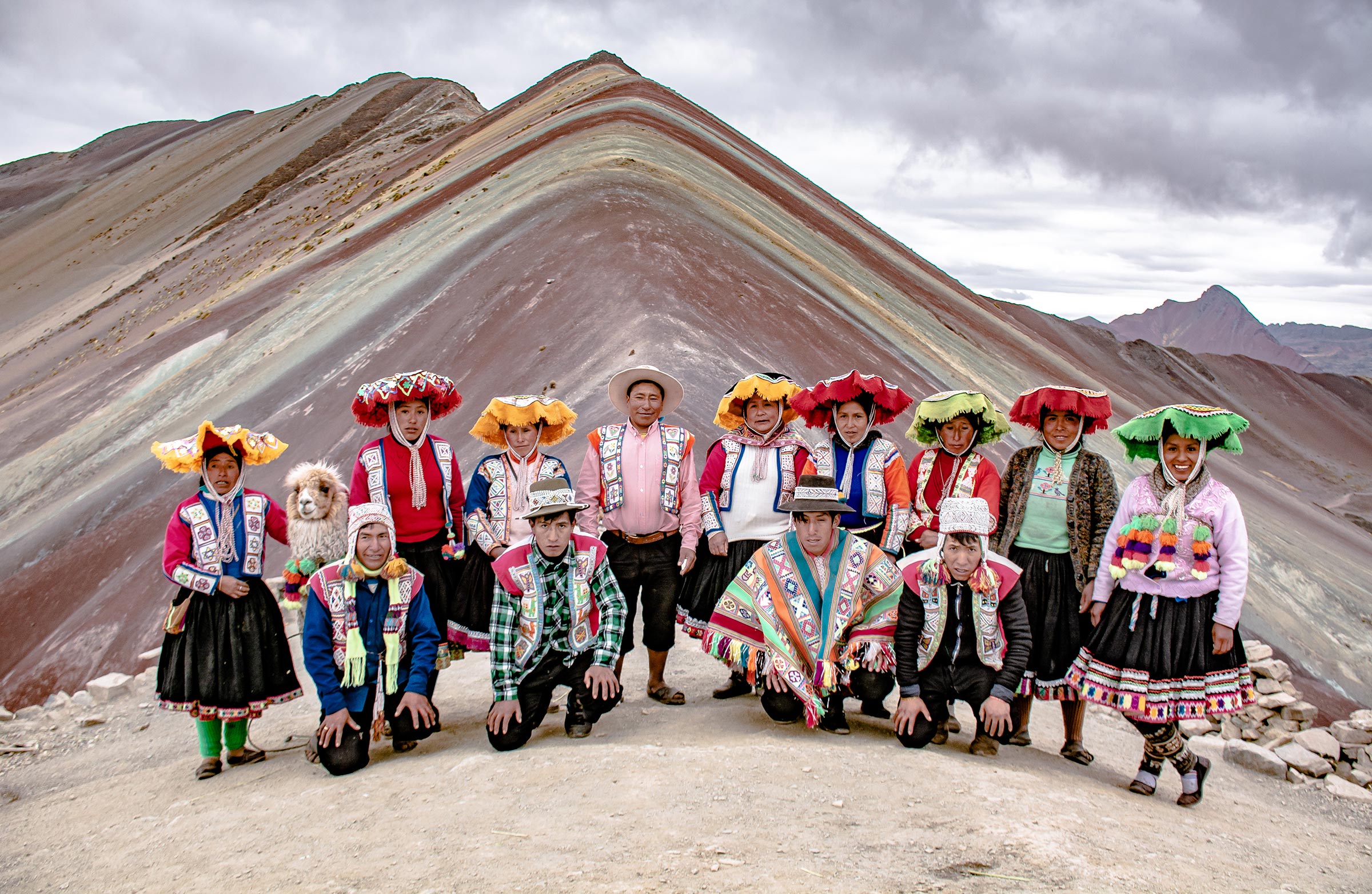 The Winicunca community in traditional attire at Rainbow Mountain, Peru