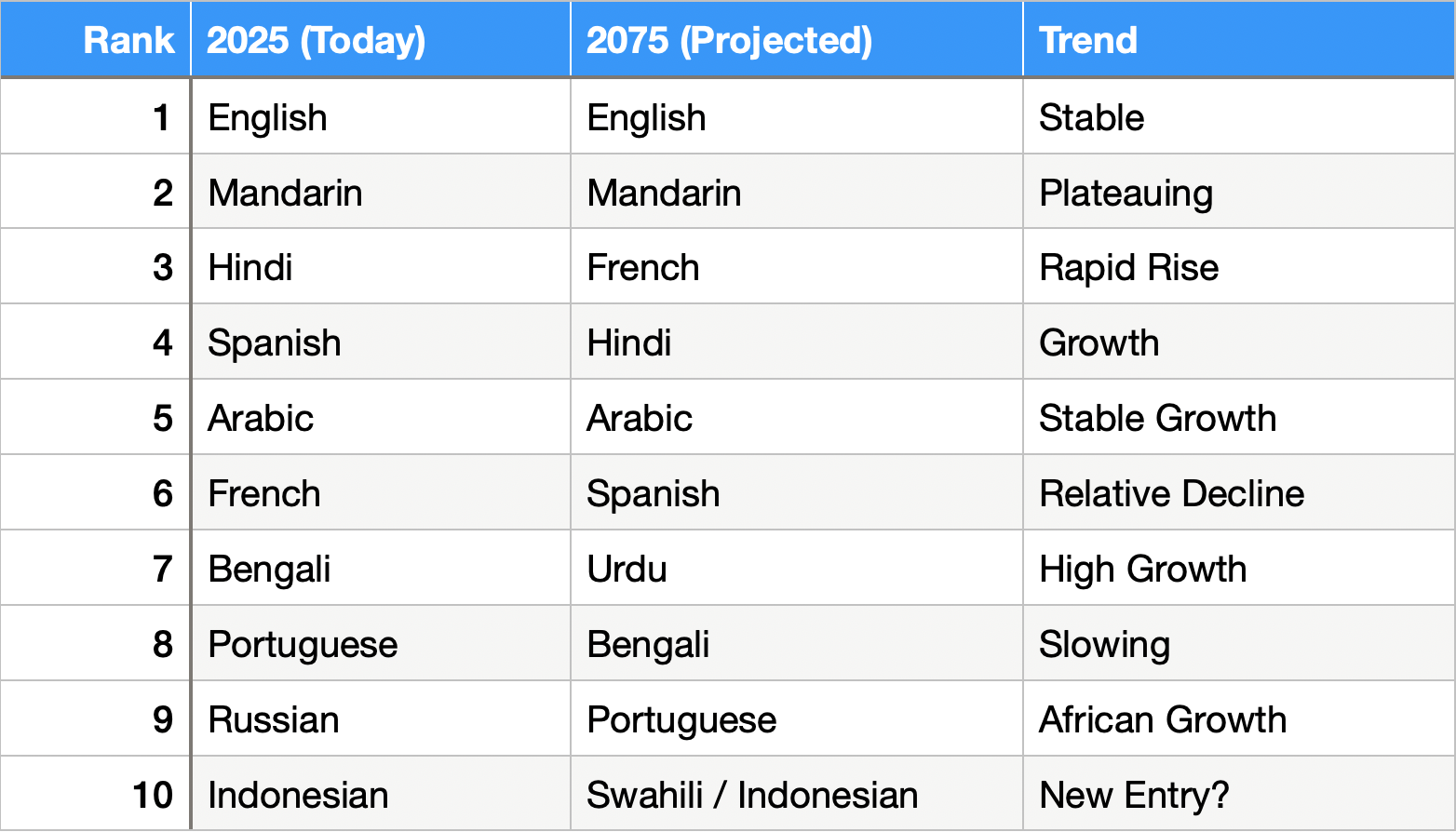 Languages like French, Bengali, Portuguese, Russian, and Indonesian round out the top ten. But the demographic engines driving these languages are changing gears.