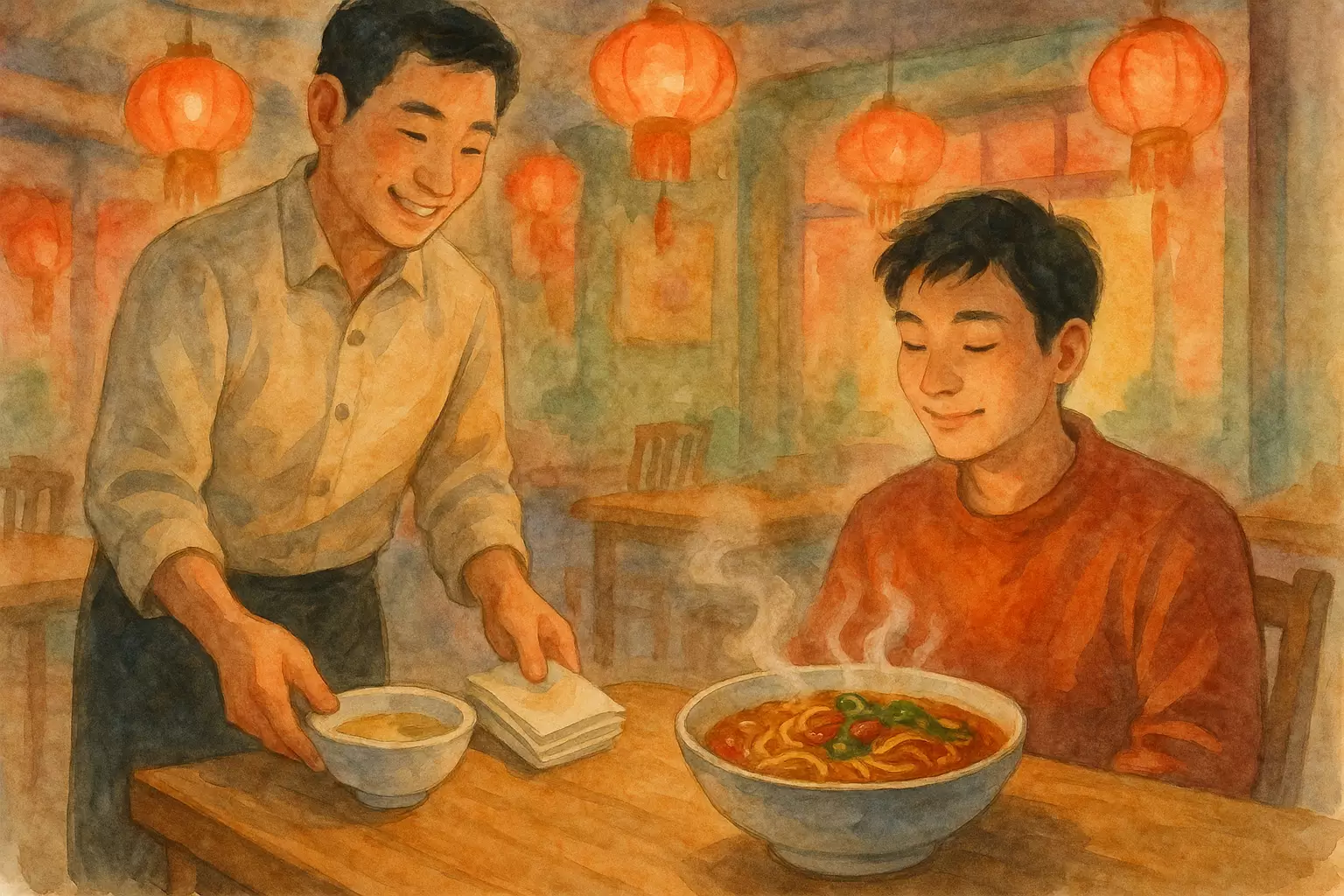 After school, two friends eat at a small Chinese restaurant. They order noodles, dumplings, and tea; a friendly waiter helps when the food is too spicy, and they pay with their phones.