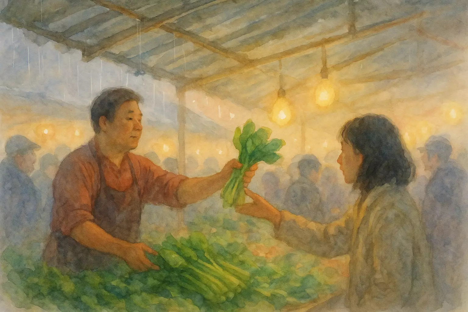 On a rainy morning, a regular customer navigates a bustling wet market, bargaining with a friendly vegetable vendor and decisively buying fresh fish while reflecting on the city's everyday vitality. The story centers on sensory details, quick choices, and the warmth of market relationships.