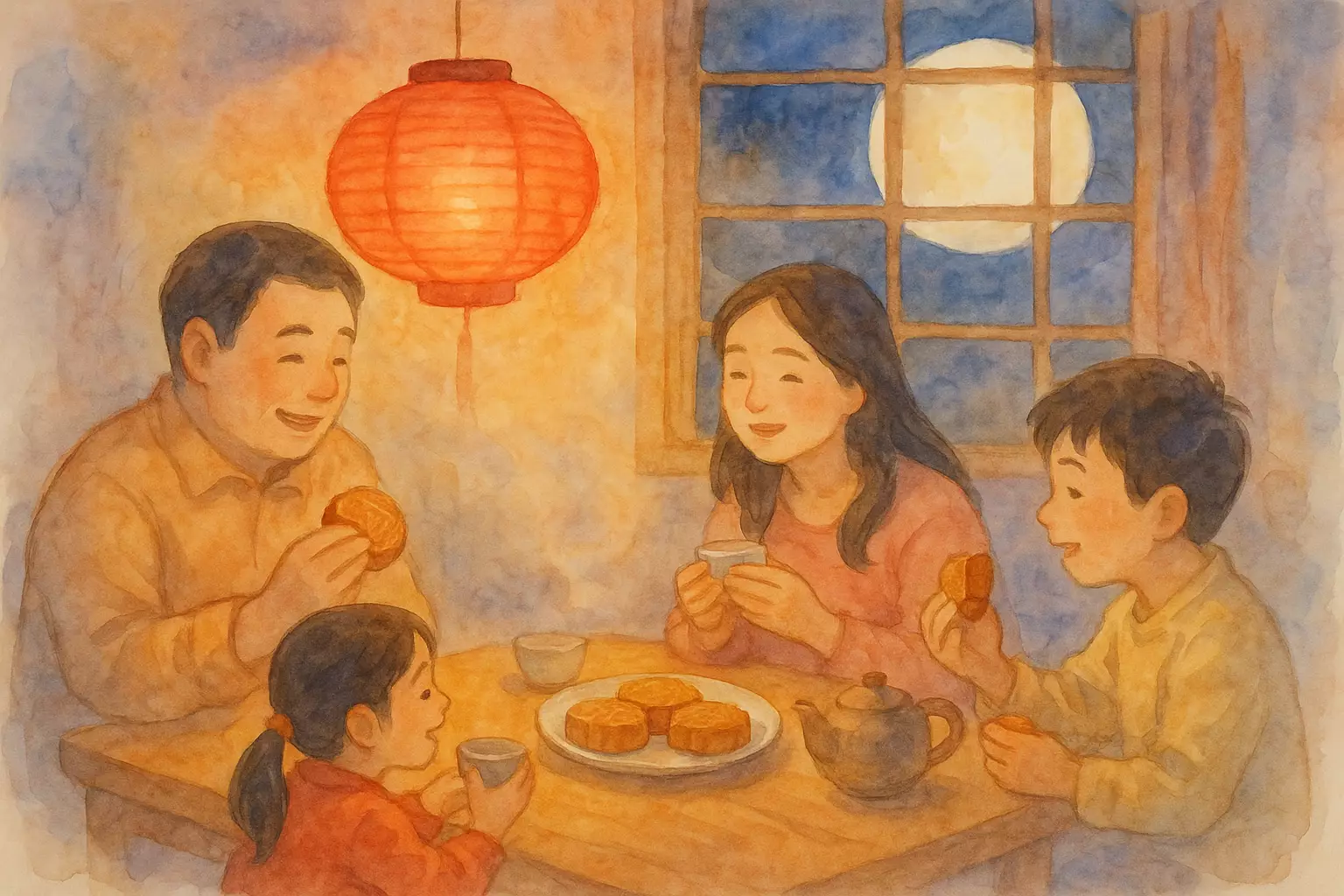 On the Mid-Autumn Festival, a family goes to the market to buy mooncakes, tea, and a red lantern. At night they brew tea, light the lantern, share mooncakes, and watch the round moon together.