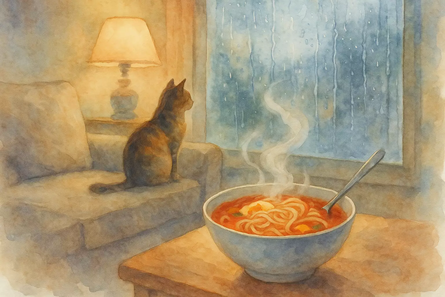 On a stormy day, the narrator stays home with a cat, cooks comfort food, calls family, and turns the quiet hours into a warm, productive time.