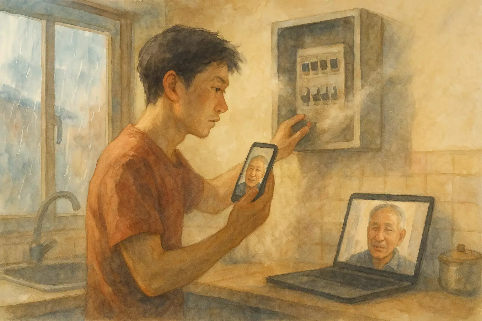 On a rainy Saturday morning in a Chinese apartment, the narrator loses power in the kitchen and, with video guidance from their father, repairs the wiring and restores normal life. After a quick trip for parts, they finish the job and feel newly confident.