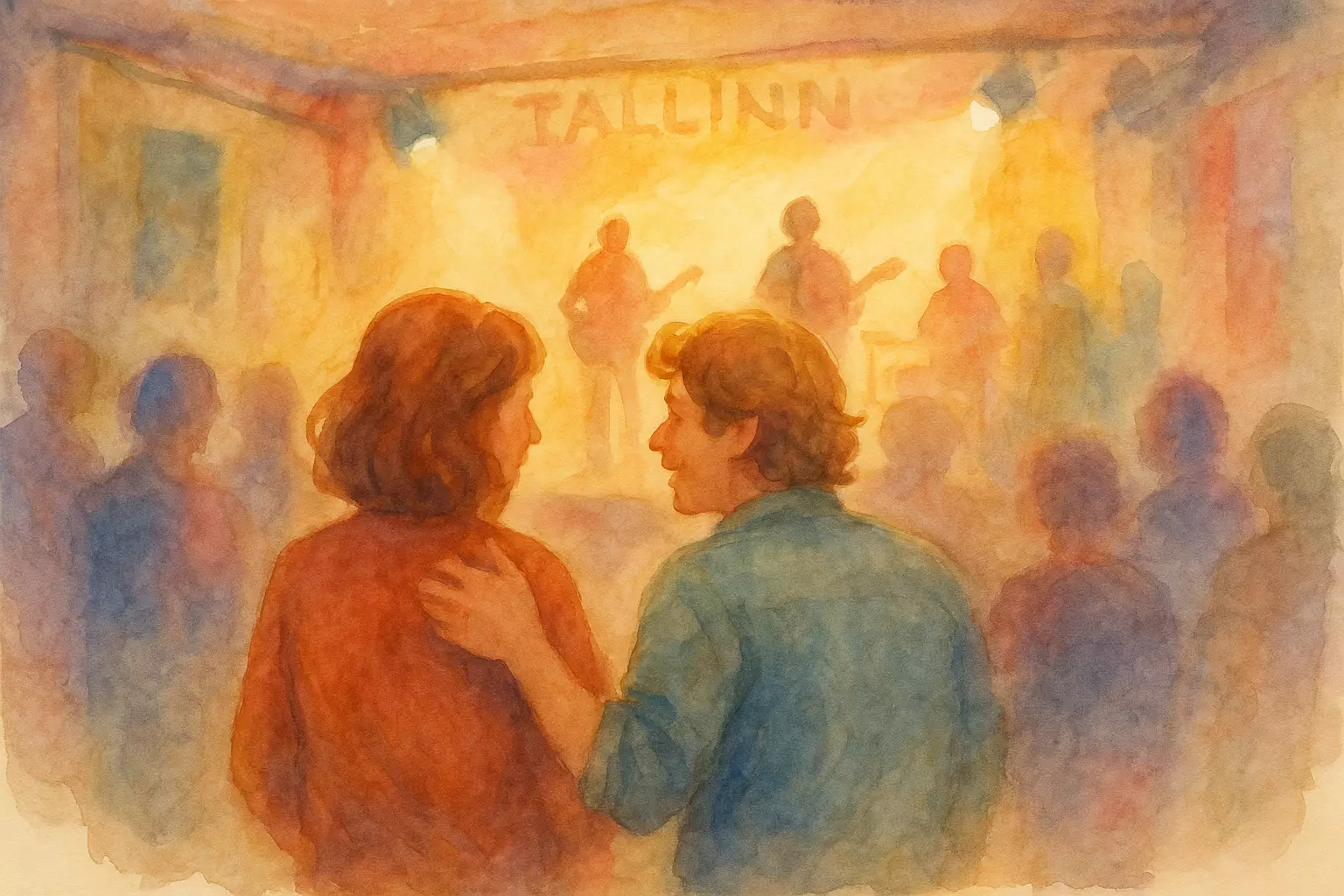 In Tallinn, the narrator and Kadri go to a small club concert after a tram ride. They wait in line, enjoy familiar songs, and head home late by tram.