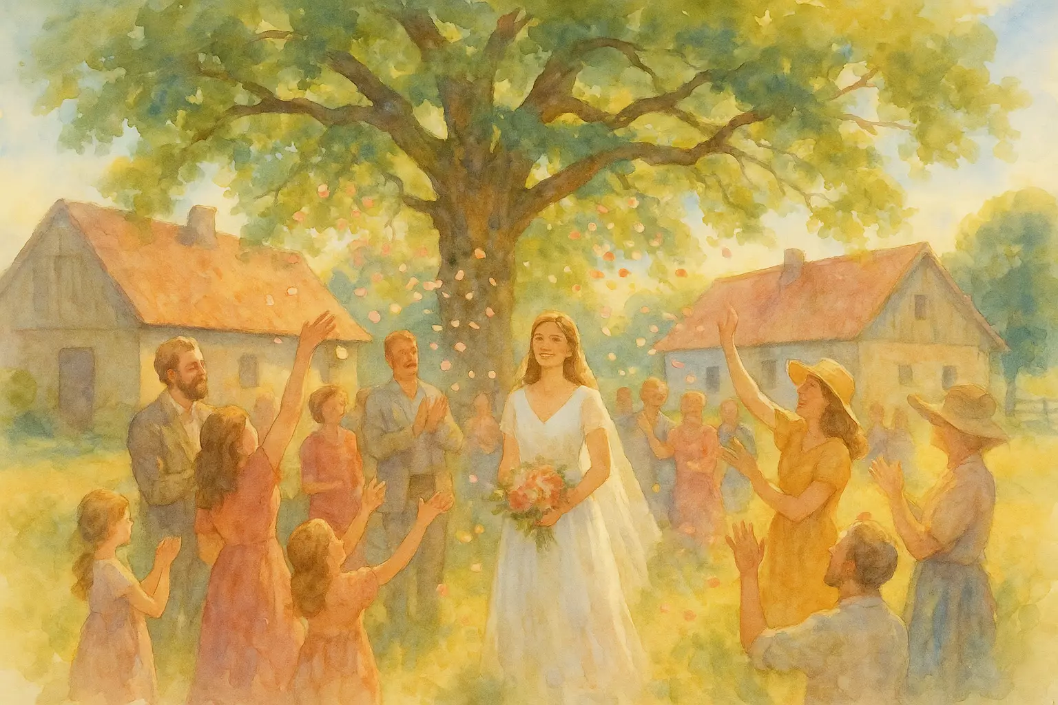 A narrator takes a bus to the countryside for cousin Kadi’s wedding to Jaan, with a ceremony under a big oak, traditional food, and dancing. Family and friends celebrate with flowers, stories, and the Kaerajaan.