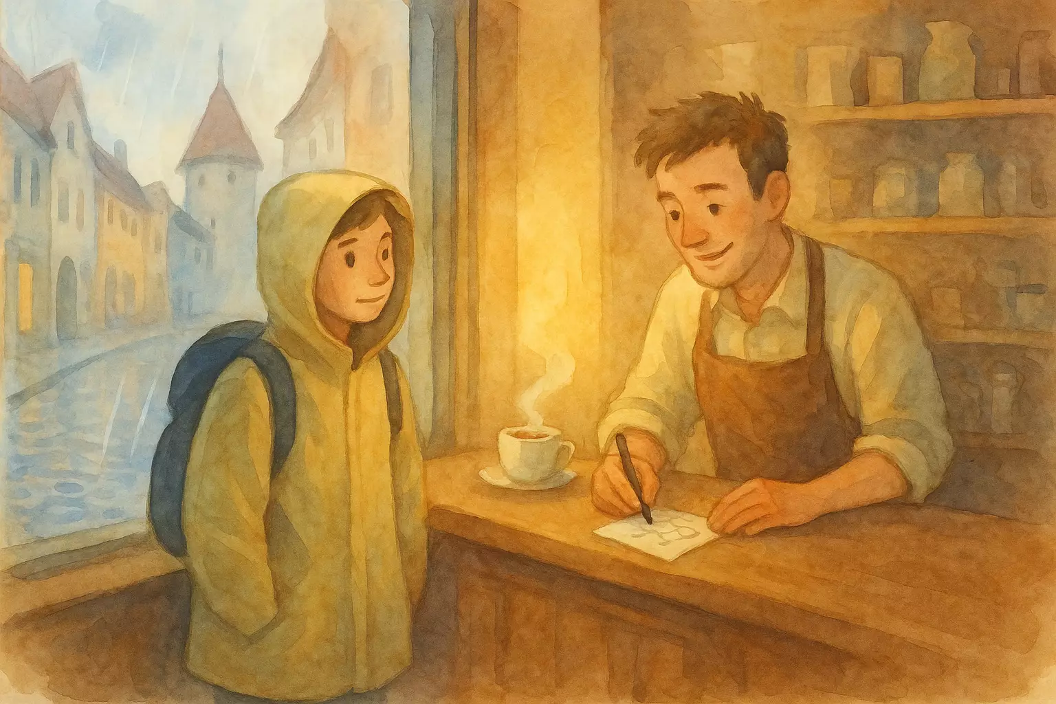 On a rainy day in Tallinn, a traveler gets lost in the Old Town and asks for help in a café; a friendly worker draws a map so the traveler can find Town Hall Square. The story ends with relief and confidence.