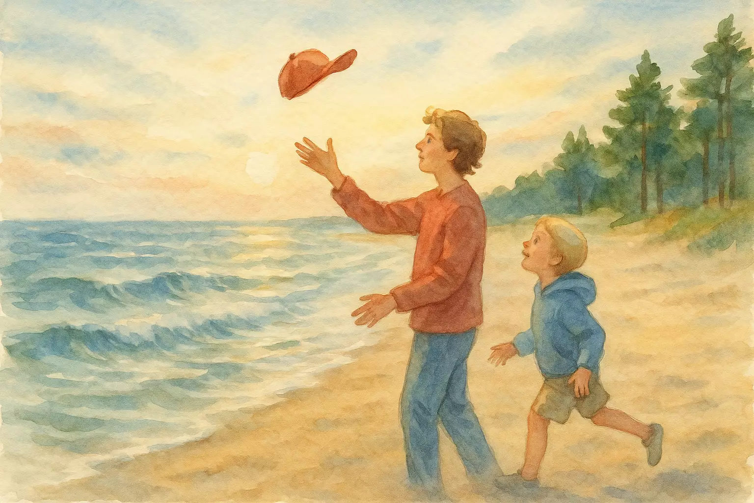 A young narrator escapes to Pirita Beach to clear their head, shares tea and stories with an elderly neighbor, and together they help retrieve a child's cap, leaving the narrator calmer and hopeful. The day ends with a quiet promise to return, no matter the weather.