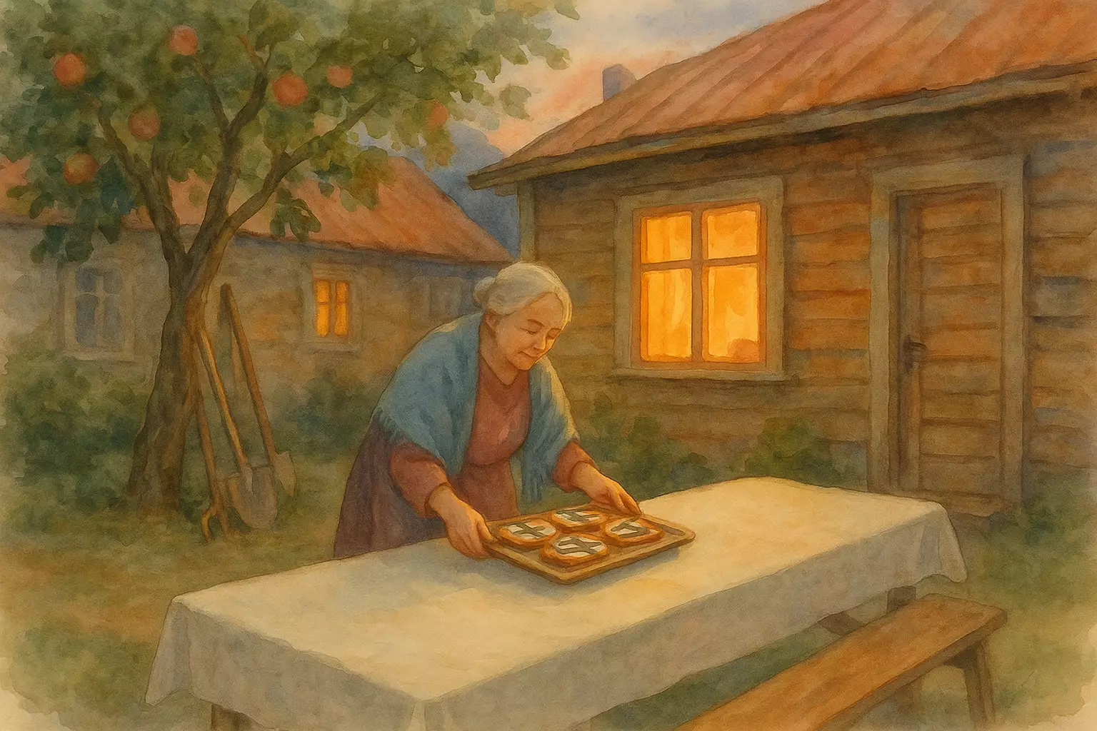 A narrator travels by train to Viljandi to visit relatives and celebrate Grandma’s new kitchen. They fix a gate together, share traditional foods, browse an old photo album, and reflect on the threads that keep family connected.