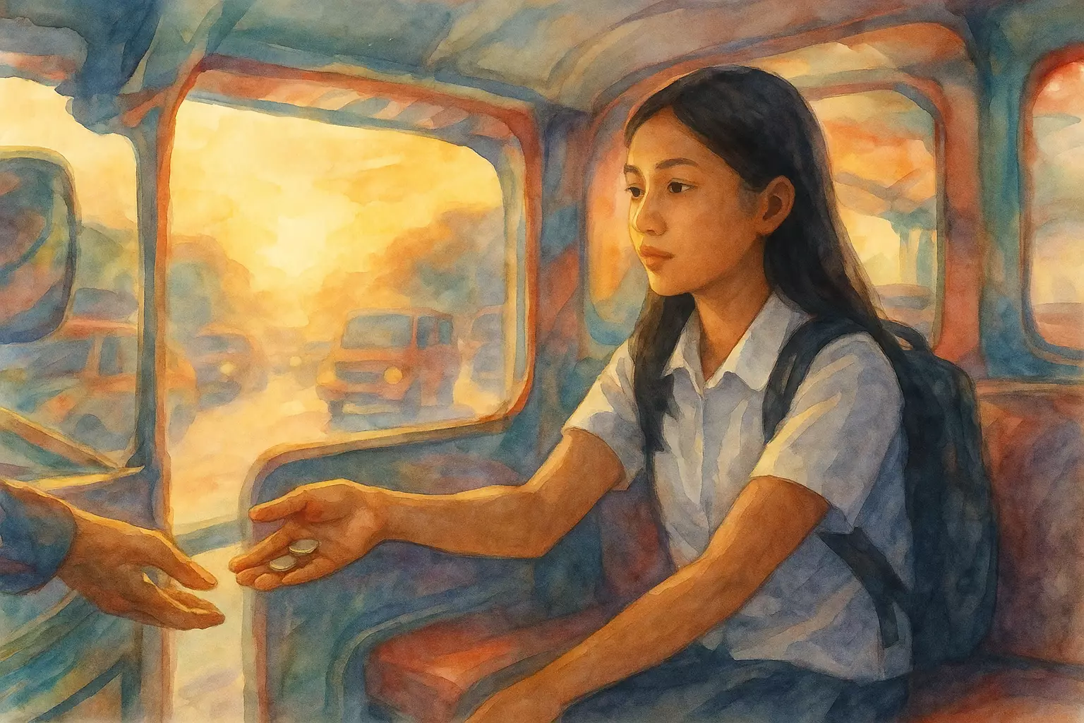 A Filipino student rides a jeep and then a train on a busy morning, saying “Bayad po” and “Para po,” and still arrives at school on time.