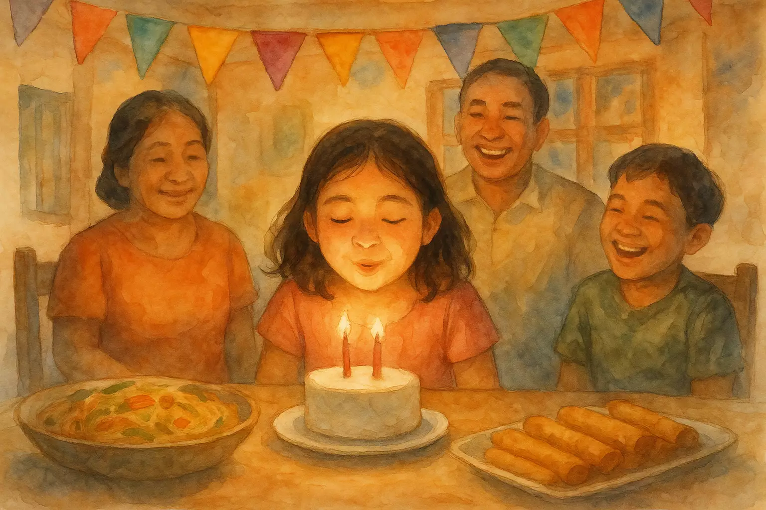 Liza celebrates her birthday with family at home. They prepare food, sing, and share a happy meal together.