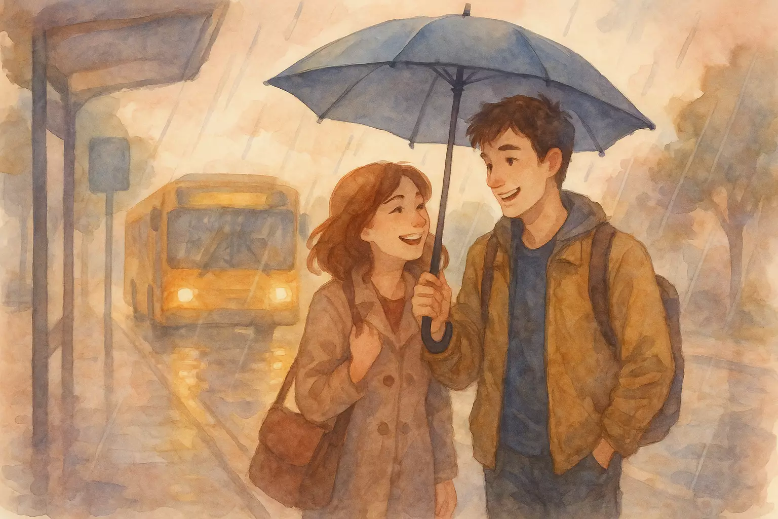 In the rain at a bus stop, Lila shares her umbrella with Karim. They talk, exchange numbers, and plan coffee, becoming new friends.