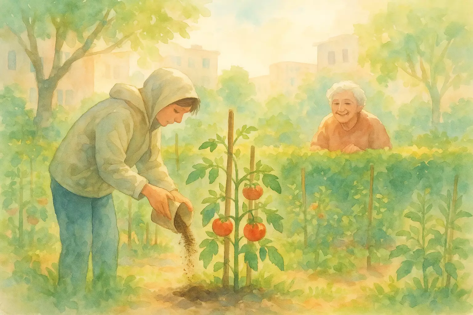 In a neighborhood community garden, the narrator cares for tomato plants with help and advice from neighbors. Coffee grounds keep slugs away, a child helps with buckets, and a ladybug brings good luck.