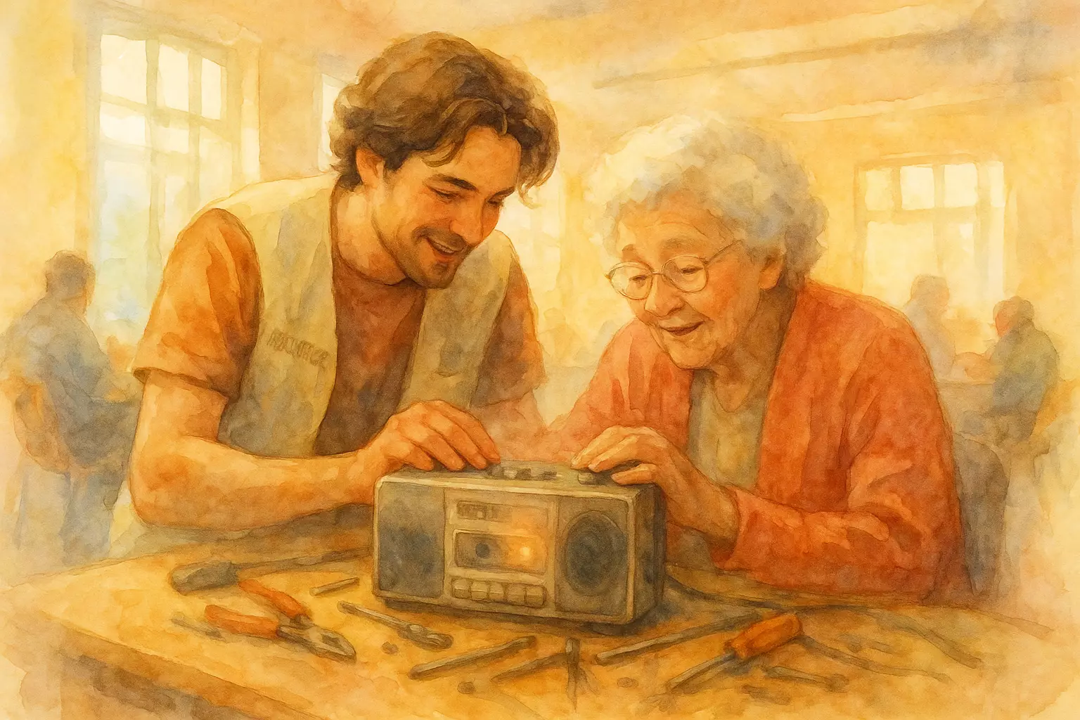 A new volunteer spends a Saturday at a community Repair Café in Saint-Denis, helping neighbors mend their beloved objects. He restores a widow’s cassette player and guides a teenager through fixing a toaster, weaving unexpected bonds across the neighborhood.