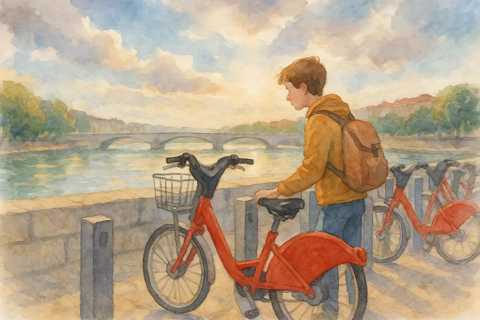 In Lyon on a Sunday, a narrator rents a city bike to ride along the Rhône, overcoming an app glitch, choosing an electric model, and savoring the city despite a sudden rain. The story follows the small challenges and simple joys of a bike-sharing ride.