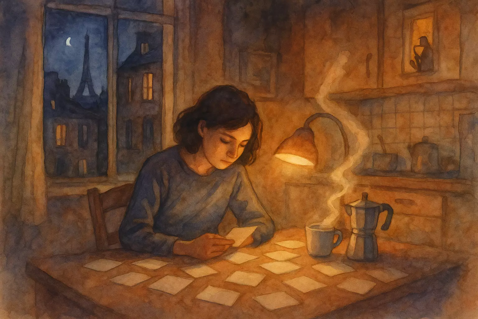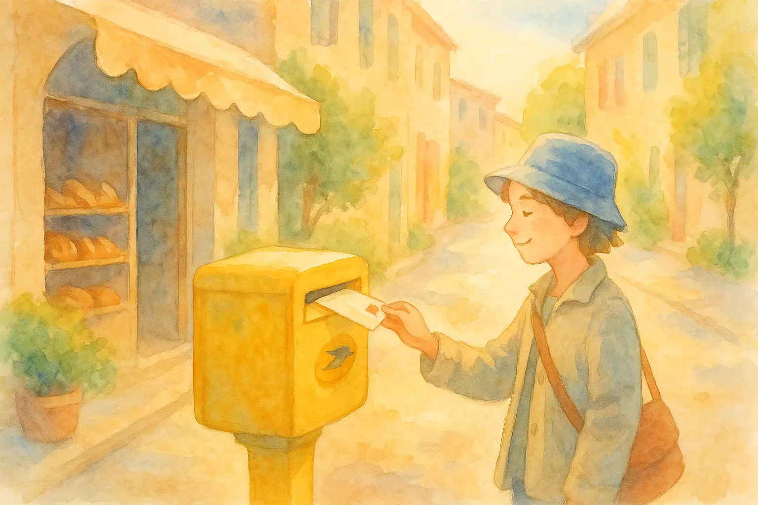 In a small French town, a young person writes a heartfelt letter to their grandmother in Lyon and mails it at the yellow La Poste box by the bakery. After sending the letter, they also email a cousin with a hint about the surprise.