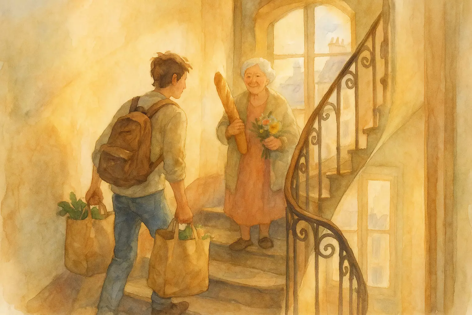 On a rainy Saturday in a French apartment building, a resident helps an older neighbor carry groceries upstairs while the elevator is broken. Small acts—opening a stuck door, organizing groceries, and posting a note—bring the neighbors closer.