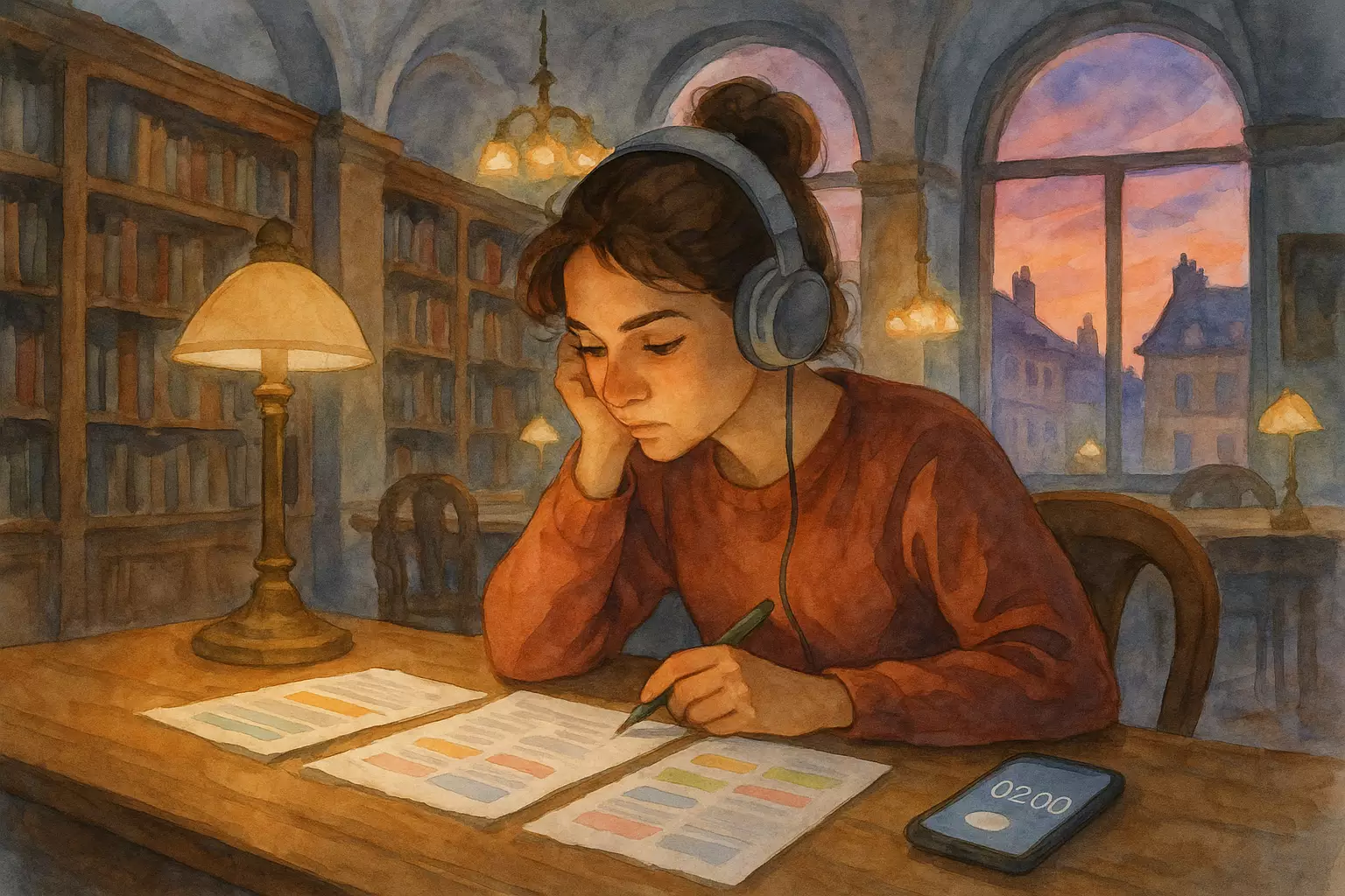 In Lyon, Nora studies hard for her sociology midterm, using a timer and a video call with a friend to stay focused, and then faces an exam question she had just reviewed. After the test, she celebrates with a pastry and newfound confidence.