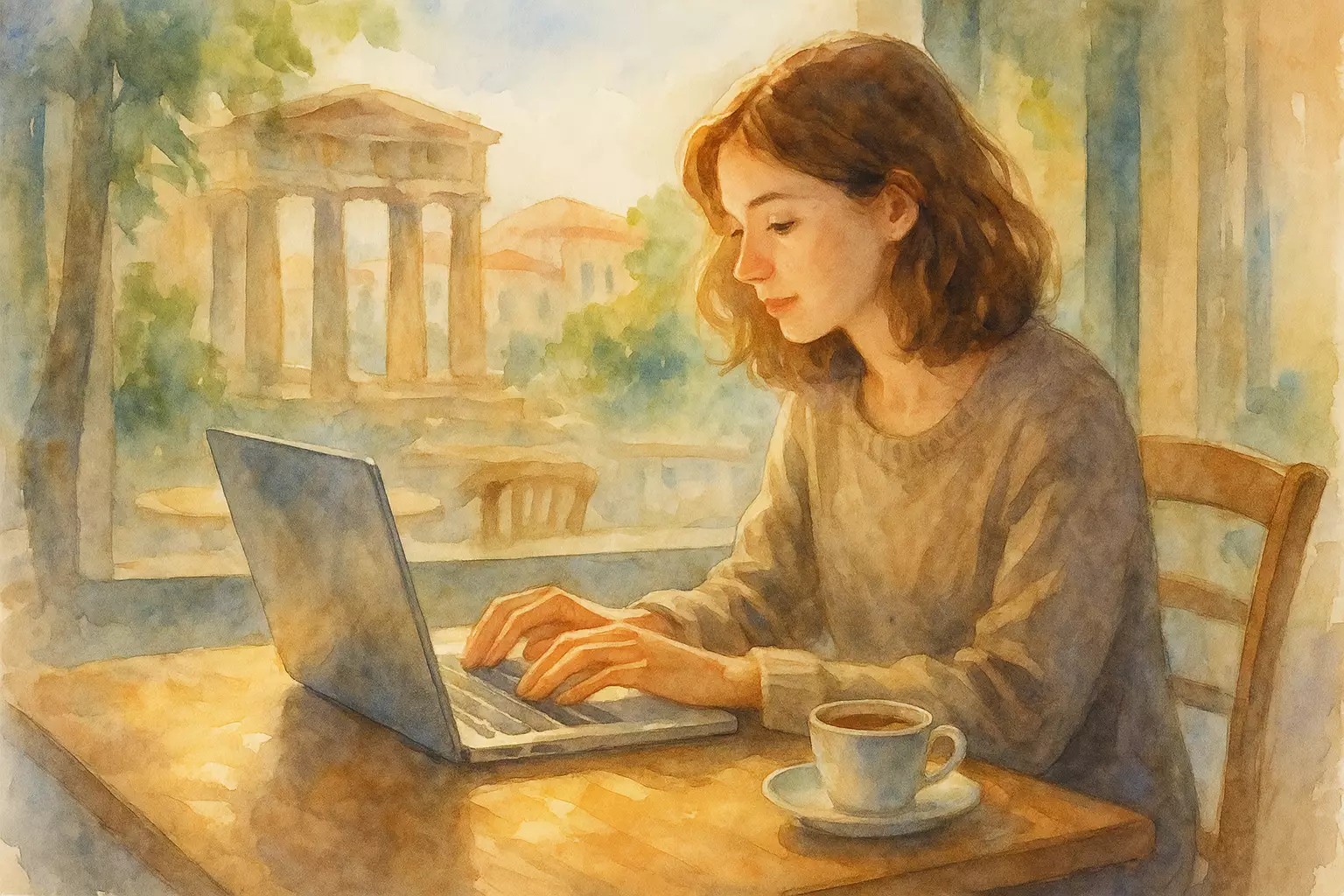 Anna sits in a central Athens café and writes an email to her grandmother on Naxos, sharing simple news about her new job and daily life. She adds a photo, sends the email, and soon receives a warm reply.