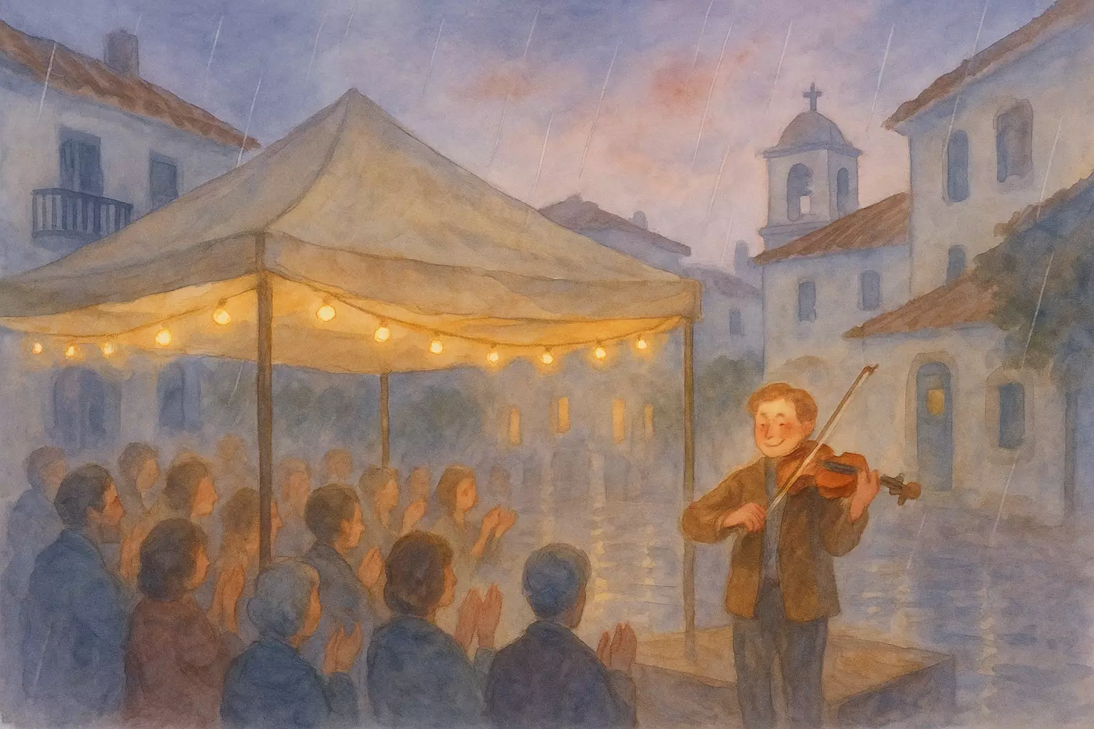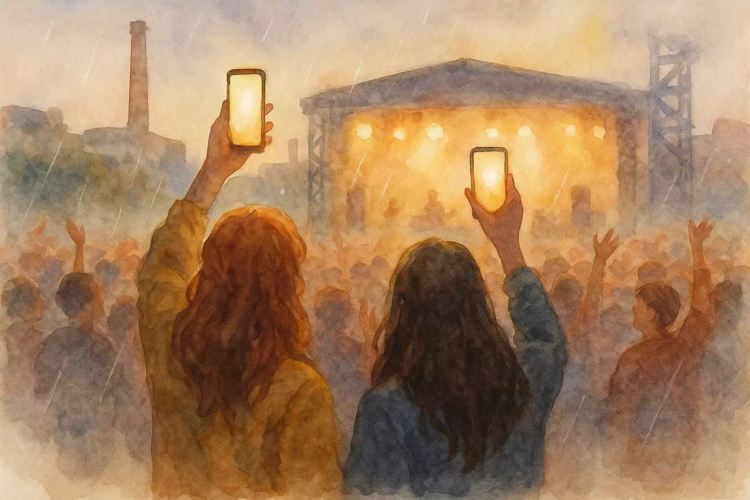 Two friends go to an outdoor concert in Gazi, Athens, face a bit of traffic and light drizzle, meet new people, and end the night thrilled and tired. The show’s energy, phone lights, and encore make it a memorable evening.
