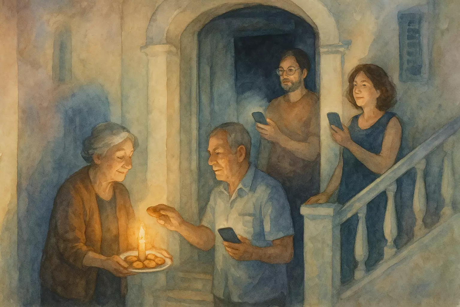 On a Sunday afternoon in a Greek apartment building, a home cook and the neighbors face a sudden power outage. They gather at the entrance, share snacks, and wait together until the lights return.