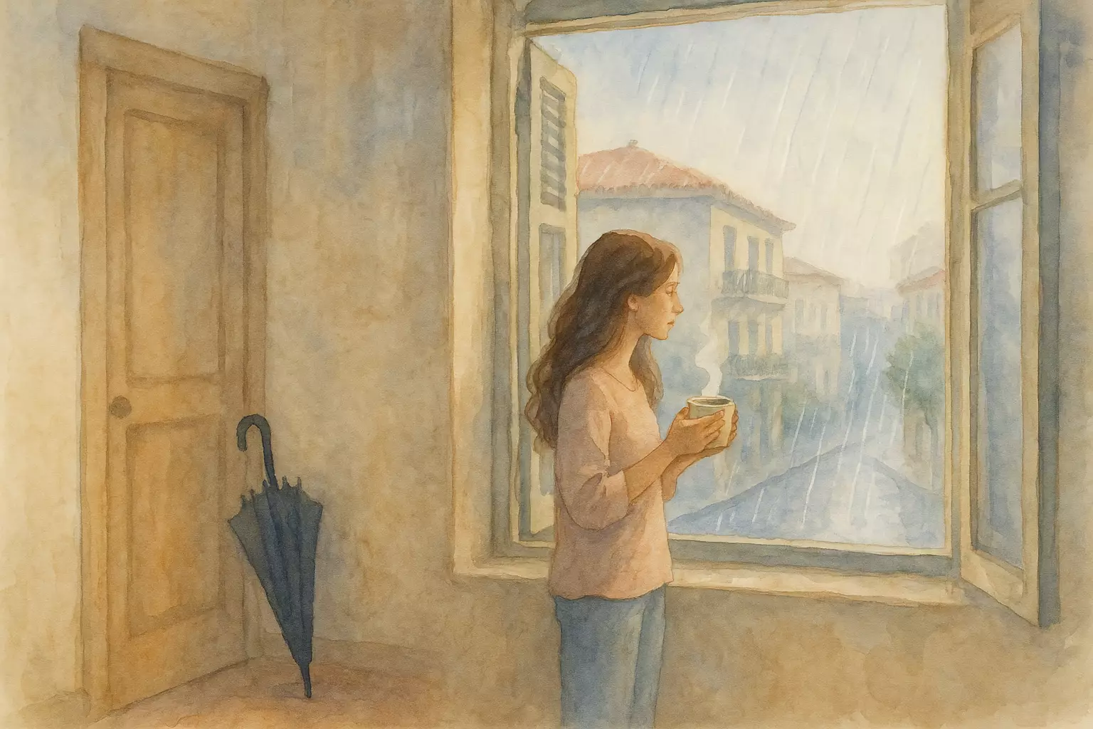Anna wakes up early in Athens on a rainy day and follows her simple morning routine before heading to the bus stop.