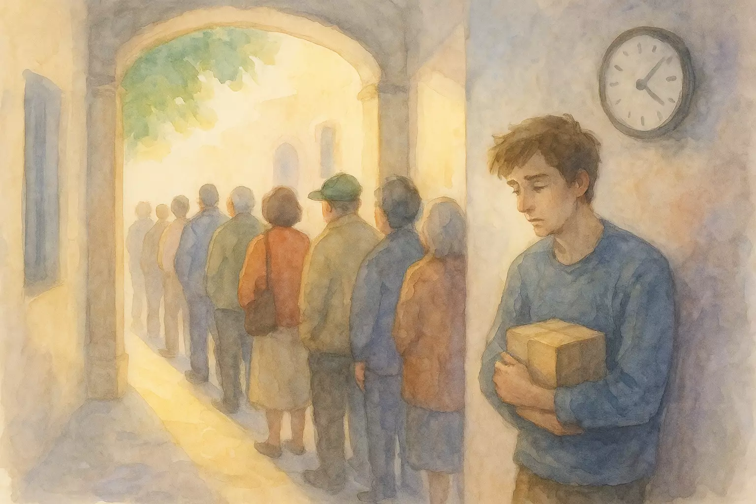 On a sunny morning, a person goes to a Greek post office to send a small package and finds a very long line. While waiting, they notice people around them until their turn finally comes.