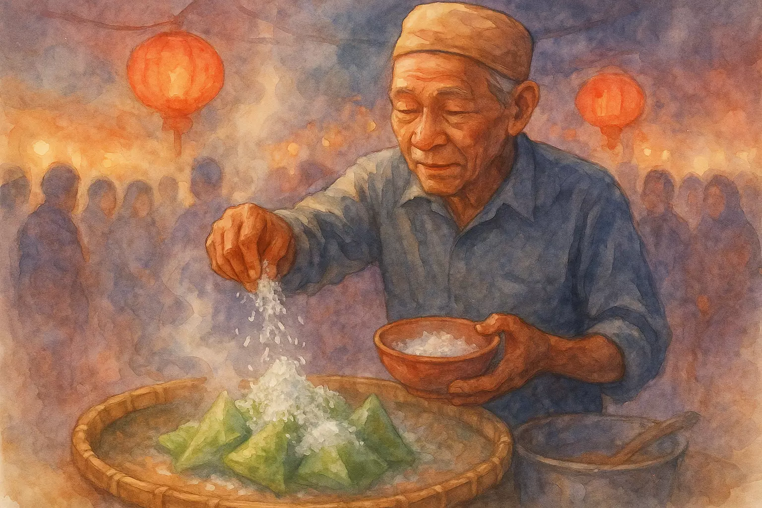 A narrator and their Aunt Sulastri weave through the crowds at Sekaten, chasing a legendary lupis stall while being waylaid by performances and conversations with local artisans. The night ends with full stomachs and a warm sense of community.