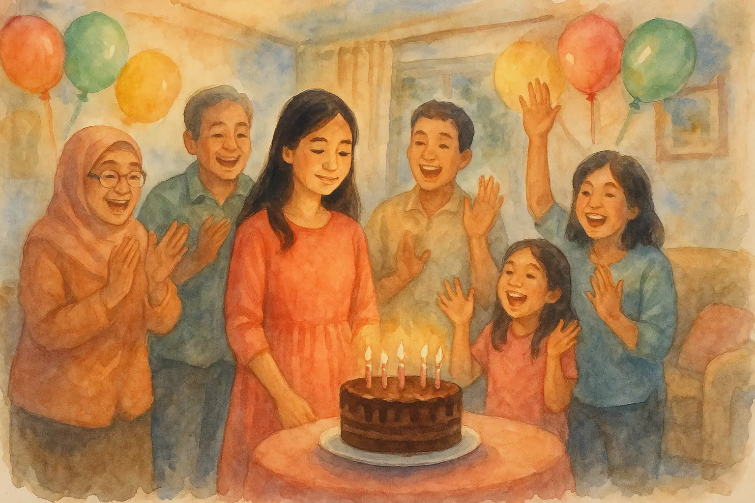Rina’s family and friends prepare a simple surprise at home. They shout happy birthday, blow candles, share cake, sing, and give a small gift.