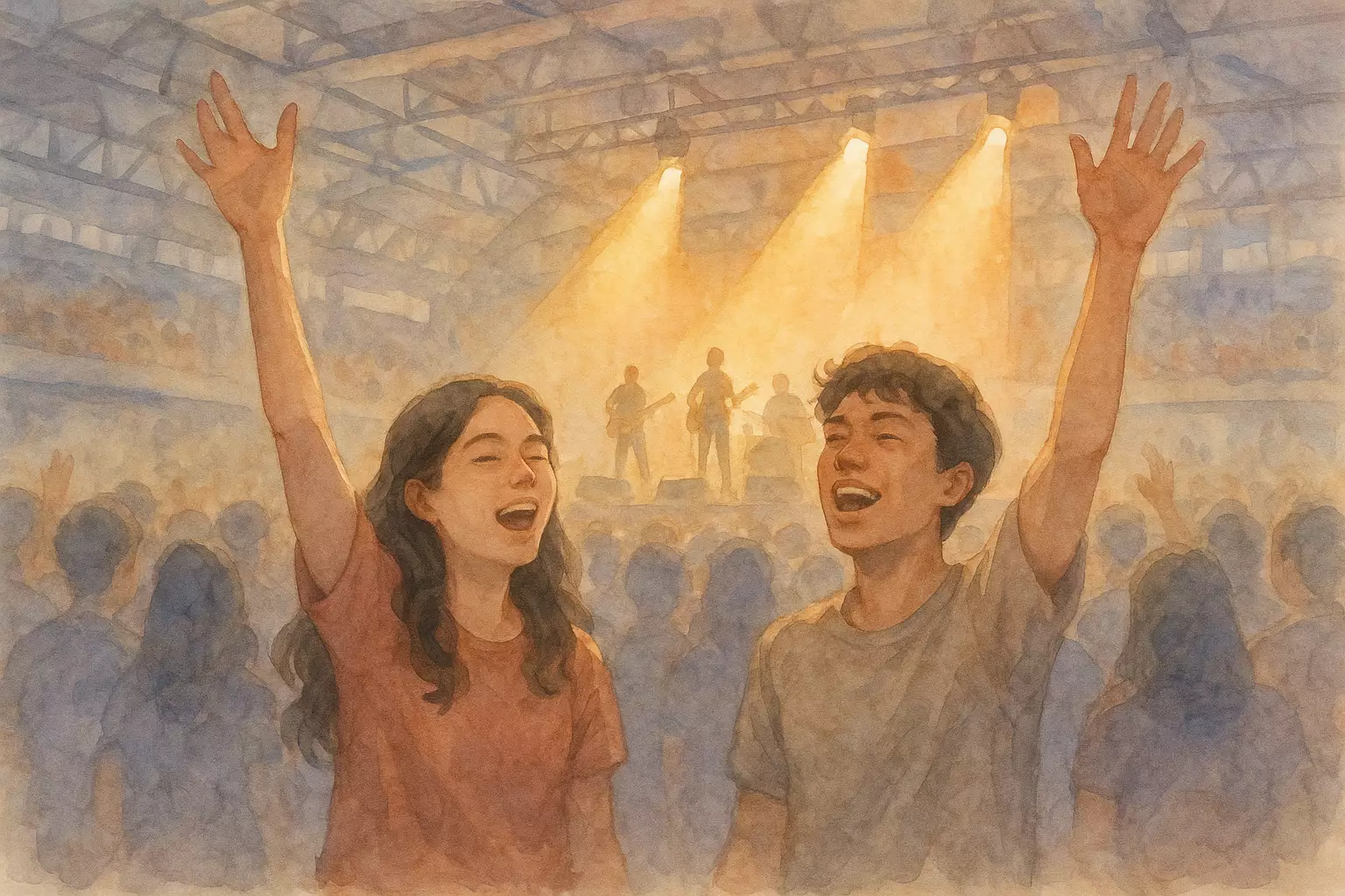 Two friends in Jakarta brave rain and traffic to attend a band concert at Istora Senayan; they sing along, witness an encore, and go home on the last MRT with souvenirs and memories.