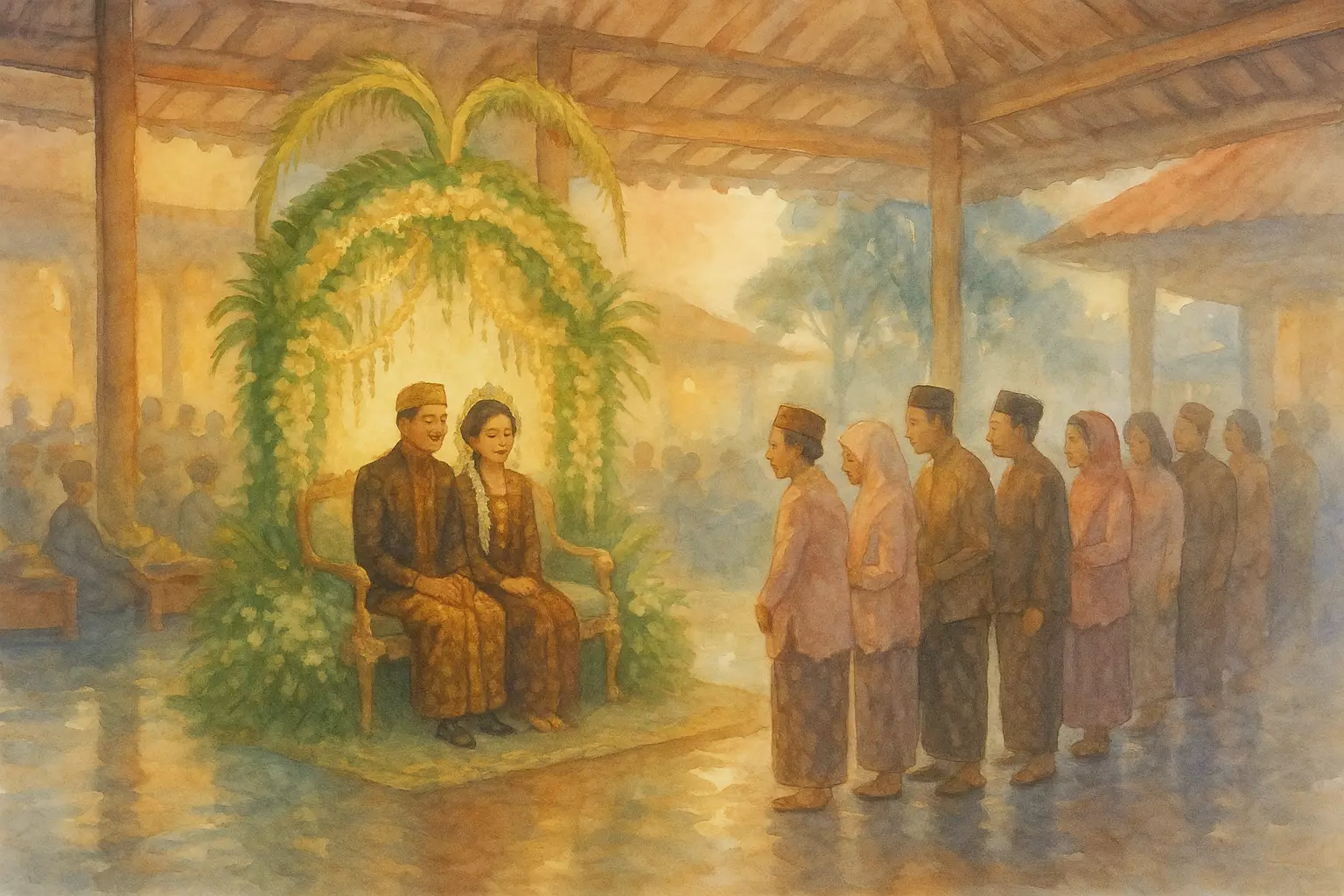 At a rain-washed community hall, a narrator attends their cousin Raras's Javanese wedding, navigating relatives' questions, a moving sungkeman, and small talk over buffet food. The evening blends nostalgia and everyday chatter into a quiet sense of shared hope.