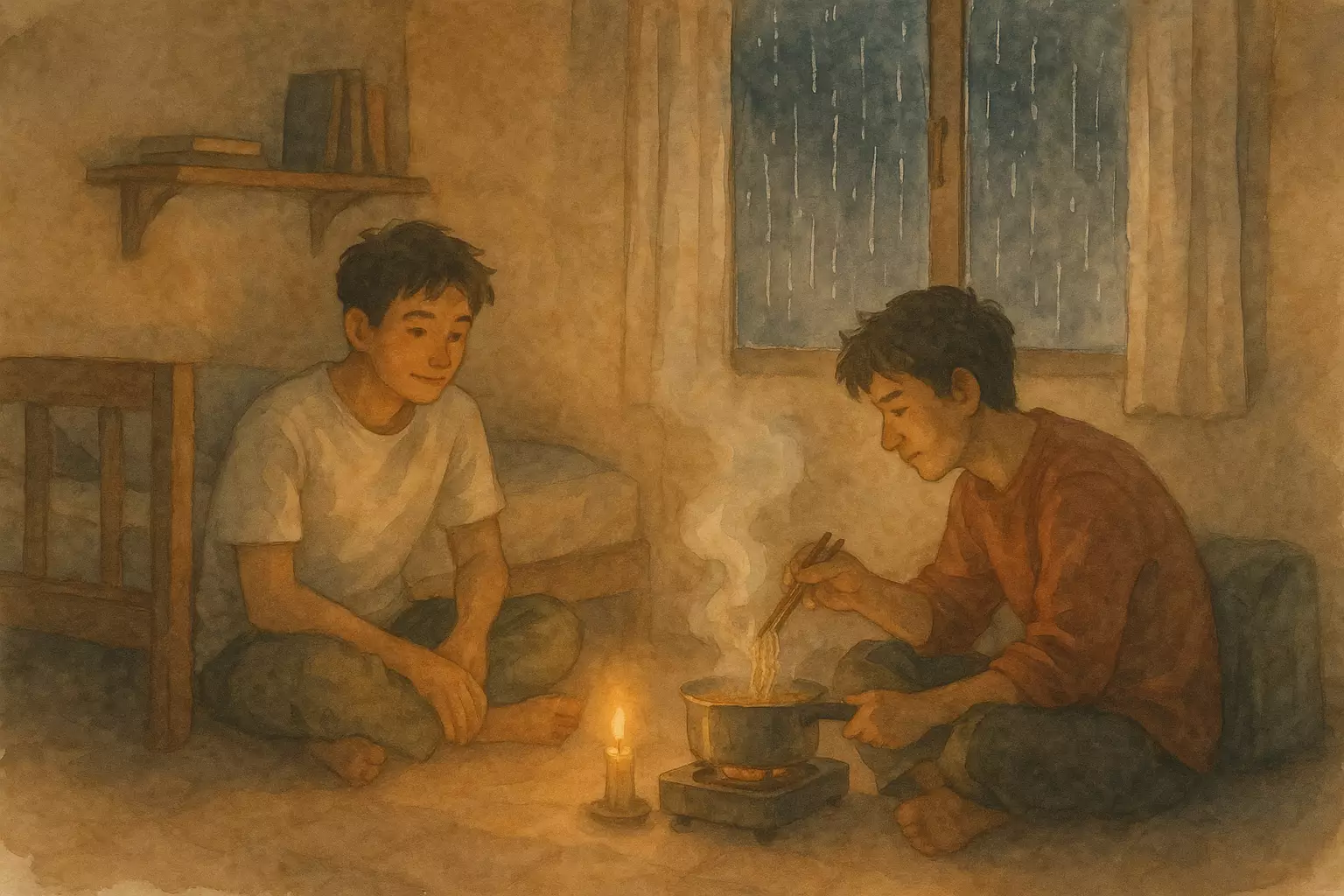 On a stormy morning in a Yogyakarta boarding house, a student and his roommate spend the day indoors after class goes online; they cook instant noodles, handle a brief power outage, help a neighbor with a leak, and pass the time reading and playing congklak.