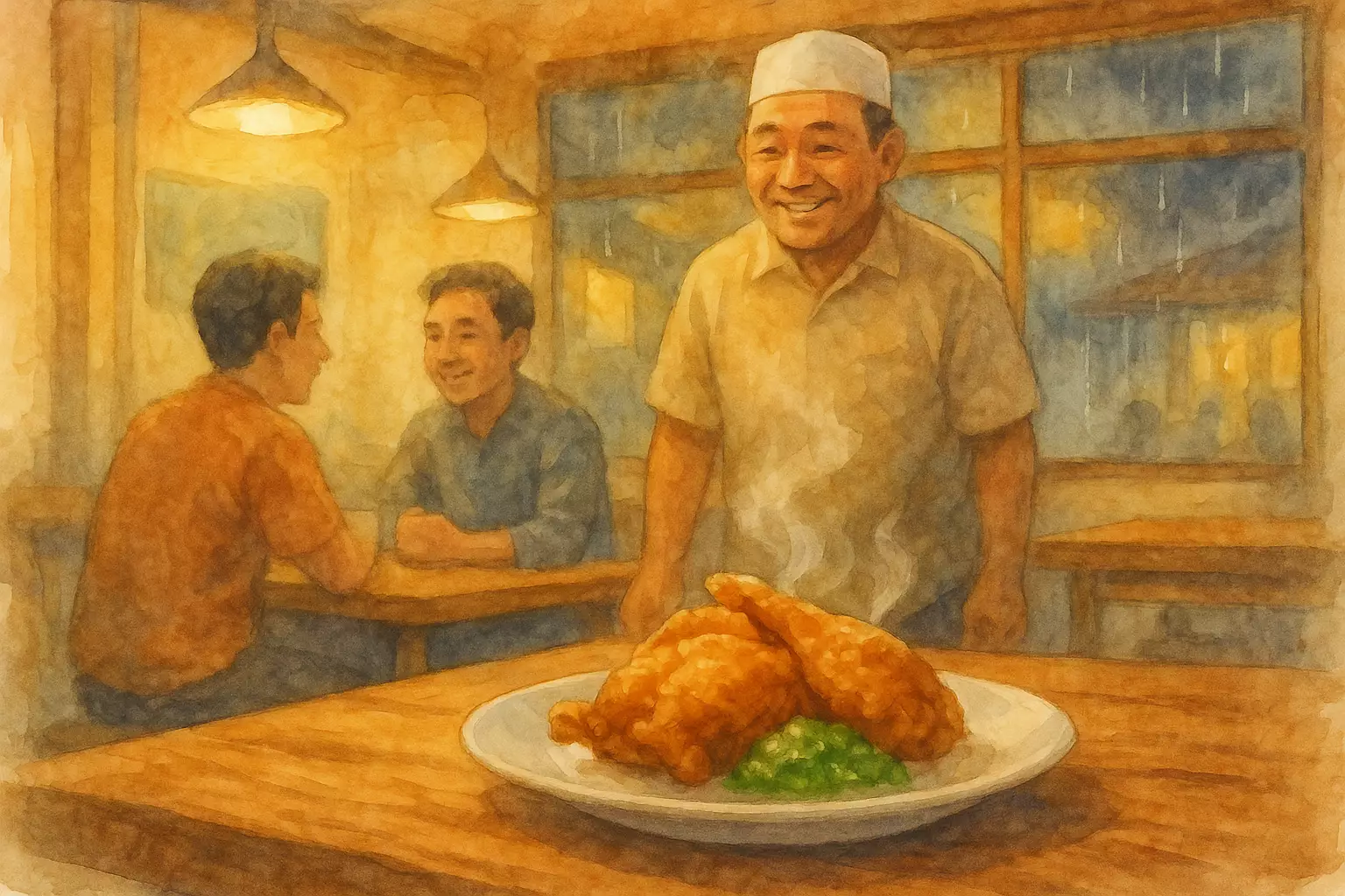 After working late, the narrator eats at a small Padang restaurant where an old friend unexpectedly joins. They enjoy spicy dishes, deal with a small payment hiccup, and leave satisfied, promising to return on payday.