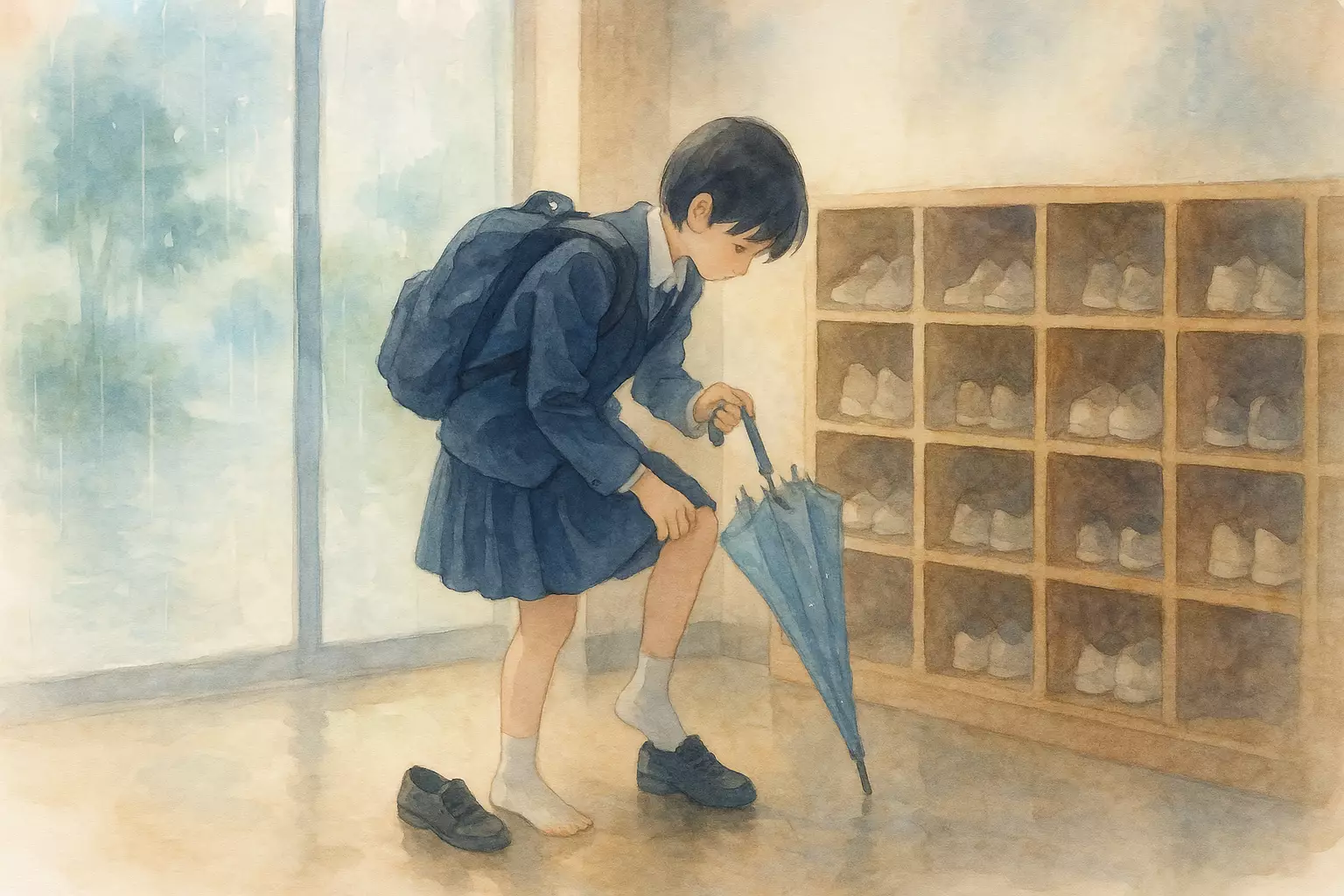 A student spends a rainy Monday at a Japanese junior high, from morning greetings and a surprise math quiz to curry lunch, chorus practice, cleaning time, and quiet study in the library.