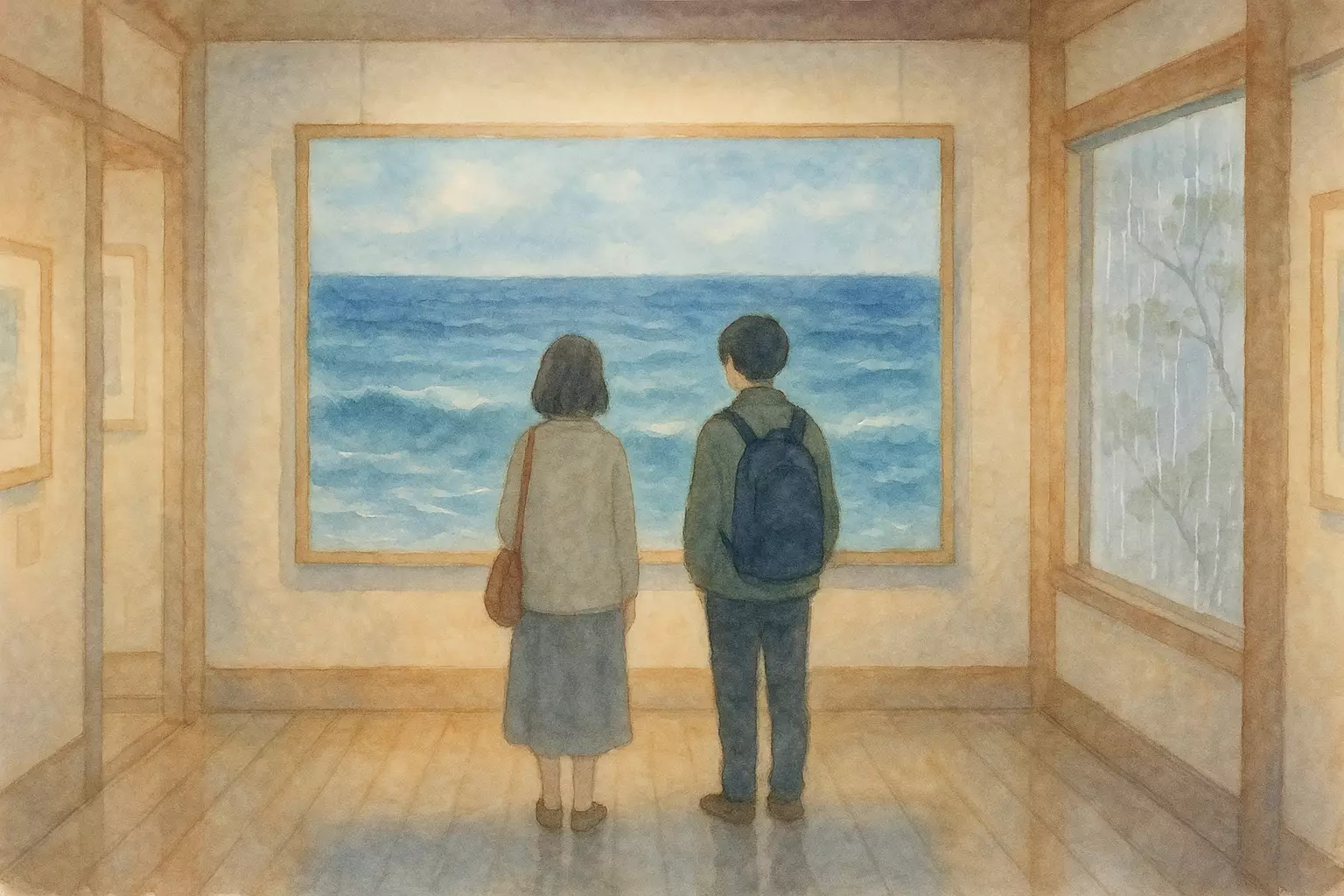 On a rainy Sunday, the narrator visits an art museum with a friend, looks at paintings, and shares favorites. They buy postcards and leave as the rain stops.