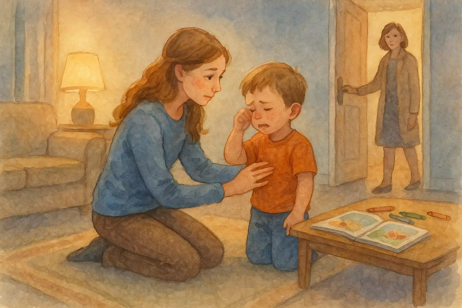 A college-aged sitter named Risa watches Yuta and his little sister Misa at the neighbor’s apartment for one evening. She comforts Yuta, reads books, handles a small spill, and puts them at ease until their mom returns.
