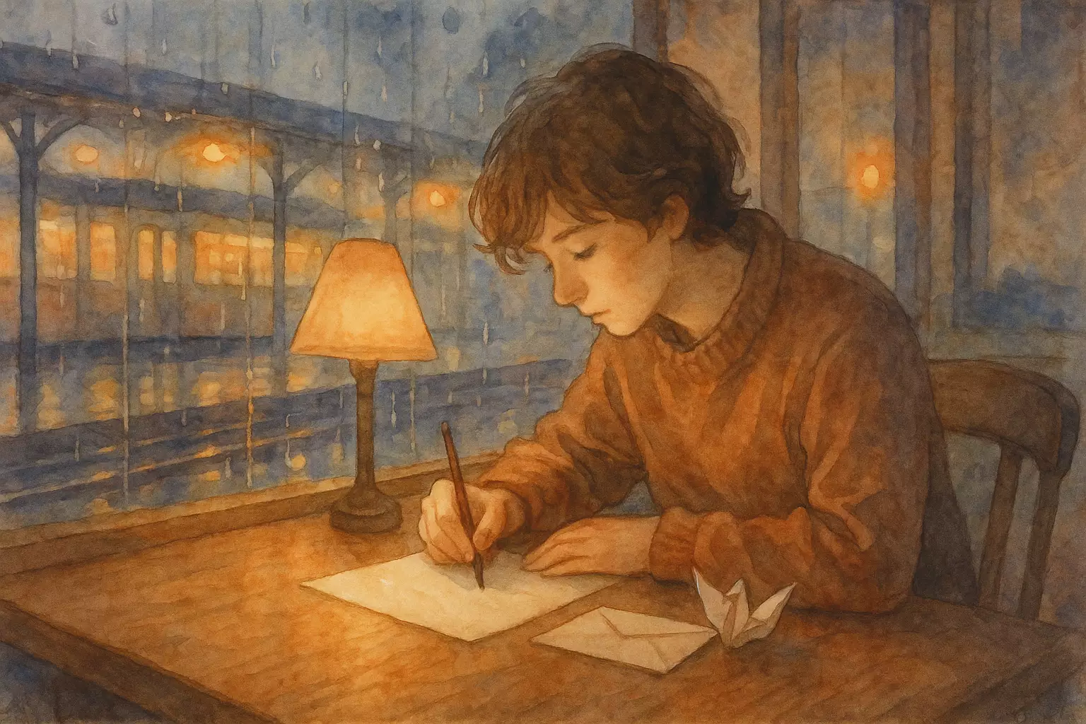 On the eve of Respect for the Aged Day in Japan, a young person decides to handwrite a letter to their grandmother in a station-front cafe and reflects on their feelings while preparing and mailing it. The story follows the calm process of writing, folding a paper crane, and posting the letter after the rain stops.