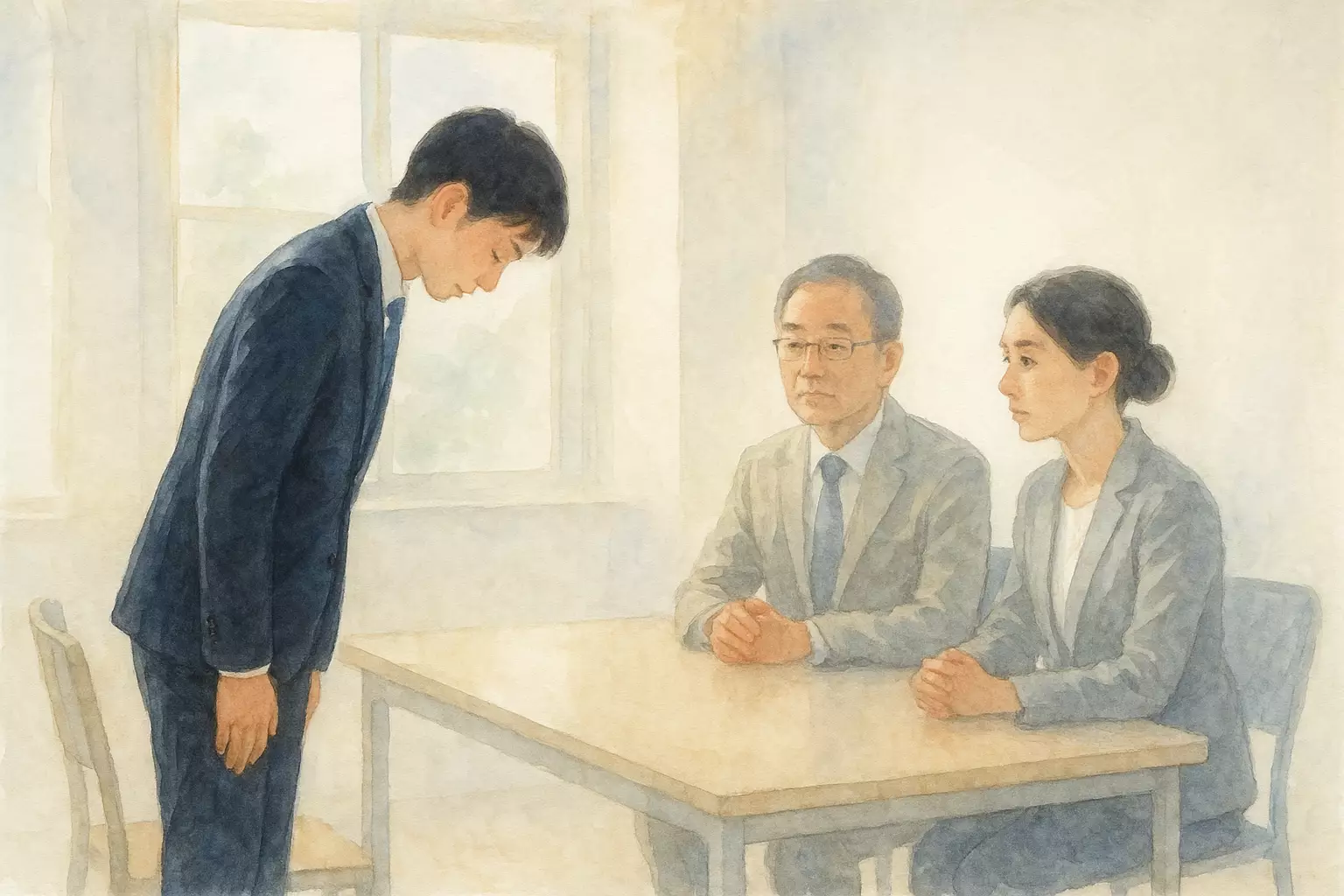 A young applicant attends a job interview at a Tokyo office, manages nerves while answering questions about motivation, weakness, and teamwork, and later receives good news. The story follows their calm but determined approach and small celebration afterward.