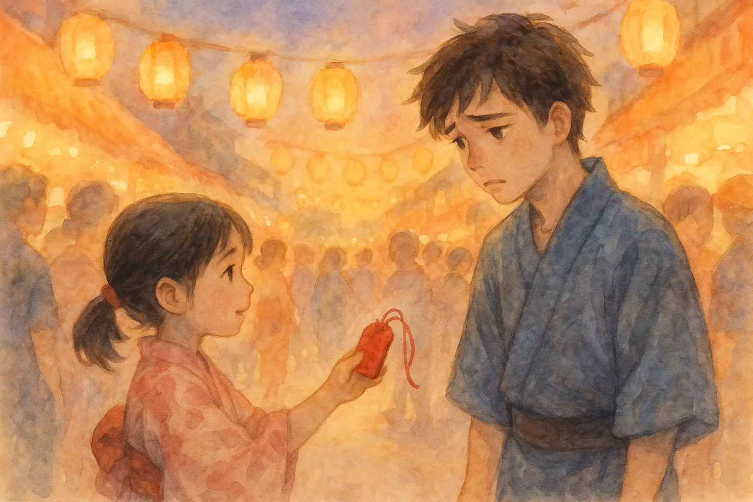 At a lively town summer festival, the narrator loses a precious charm from their grandmother and searches through the crowd until a little girl returns it. The evening ends with fireworks and relief.