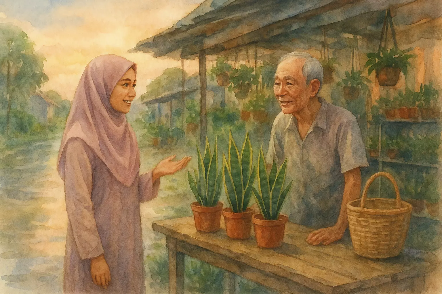 In rainy Shah Alam, a young woman searches a roadside plant nursery for a thoughtful gift for her boss’s housewarming, seeking something practical and easy to care for. Guided by the shop owner, she chooses a snake plant that turns out to be the perfect match.