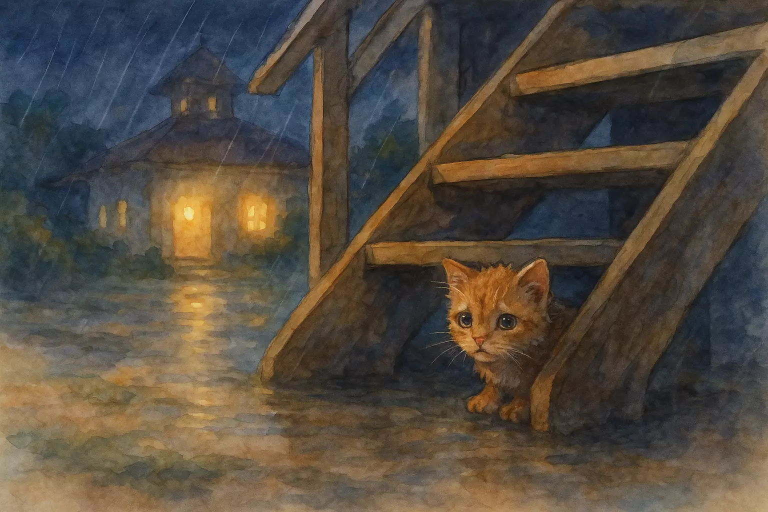A child hears a kitten after Maghrib at a neighborhood surau, takes it home with their mother, cares for it, visits a clinic, and names it Oren. The kitten becomes part of their daily life.