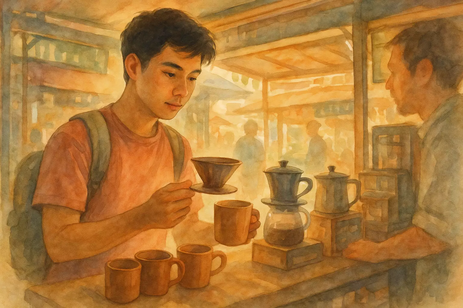 On a Saturday in Kuala Lumpur, the narrator searches Pasar Seni for a birthday present for Nabila and finally chooses a coffee-themed gift with a personalized mug. A small discount saves the budget, and the surprise at Tasik Titiwangsa moves Nabila to happy tears.