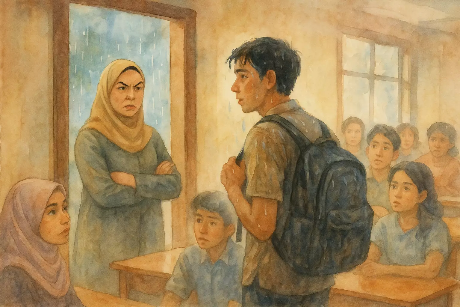 Aina navigates a hectic day at a Malaysian university, from a rainy commute and a strict lecturer to a spontaneous AI ethics debate and a last-minute printing issue, ending with hope after group study.