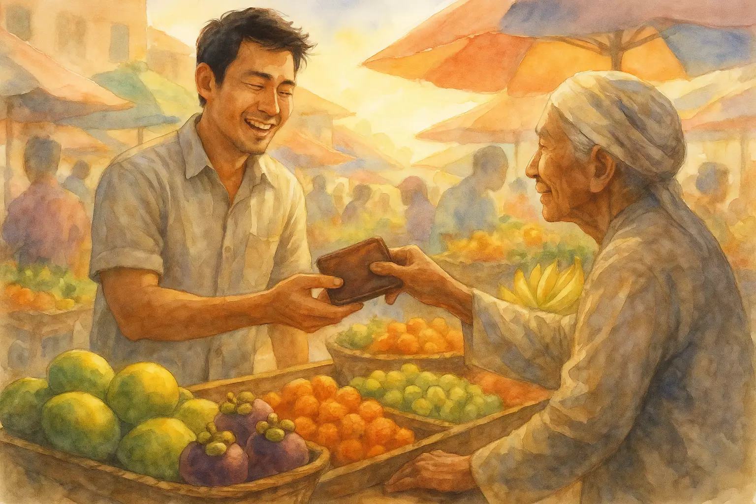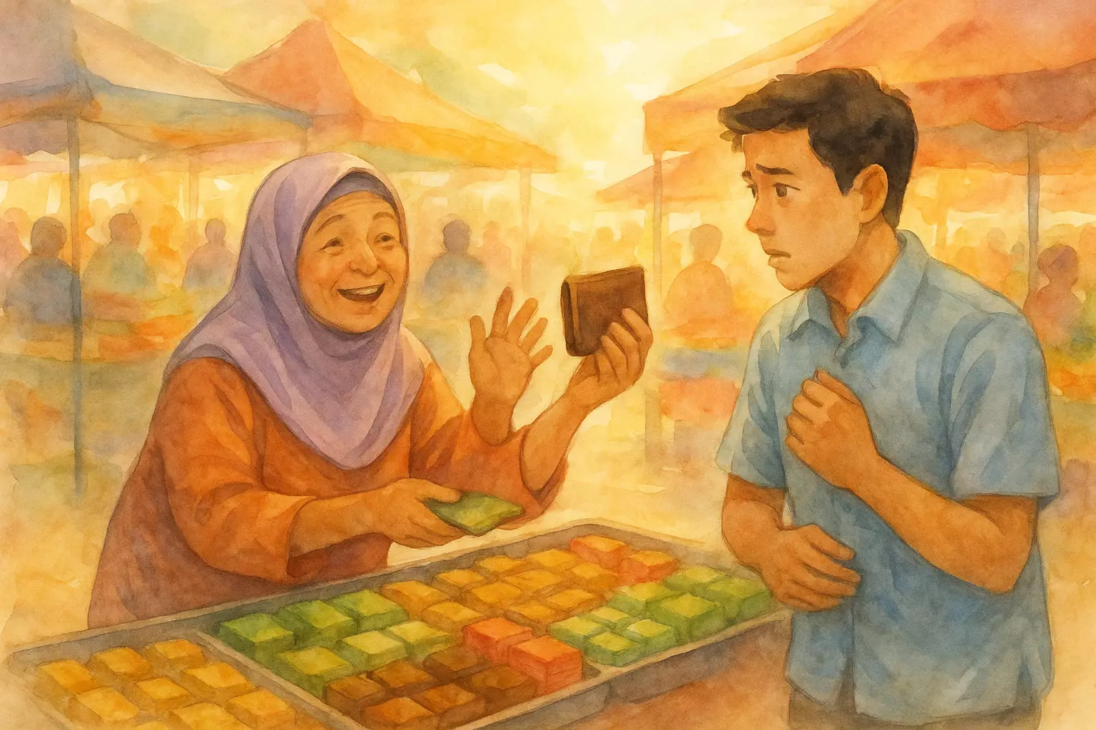 In a busy Malaysian morning market, Amir loses his wallet and feels worried, but a kind kuih seller finds it and returns it. He thanks her and decides to keep his wallet in a zipped pocket next time.
