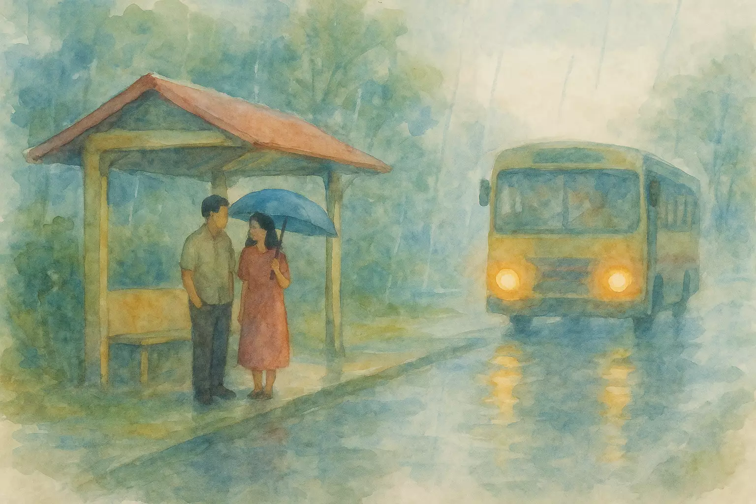 At a small bus stop in the rain, a local meets a woman from South Korea looking for the National Museum. They share her umbrella, take the bus together, and he helps her with directions.