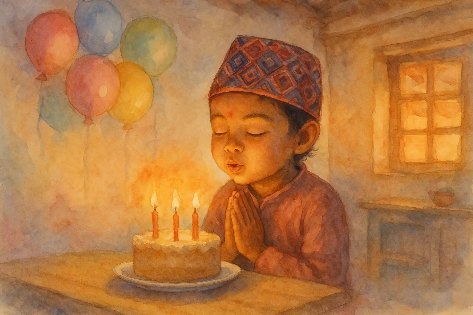 At home in Nepal, a child celebrates a birthday with family and friends. They clean the house, light candles, cut a small cake, and share sel roti.