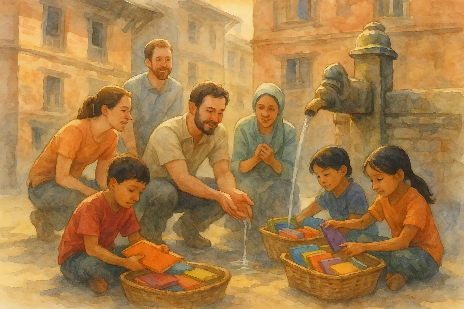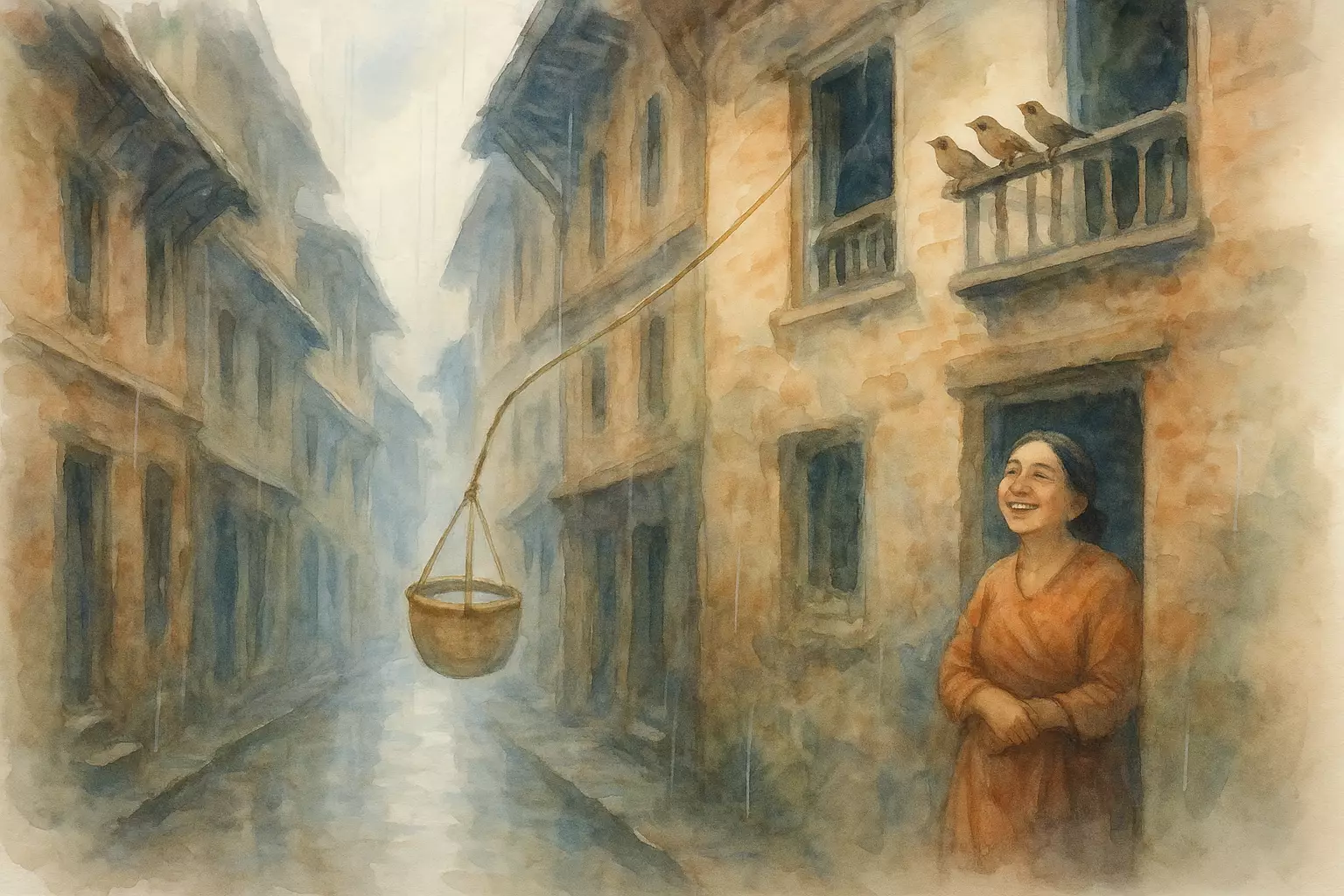 On a rainy morning in Patan, the narrator helps neighbor Maya-didi fetch water from a public hiti after the pump fails, improvising a rope-and-basket to lift the heavy buckets upstairs. Their small act of help grows into a habit and strengthens their alley’s sense of community.