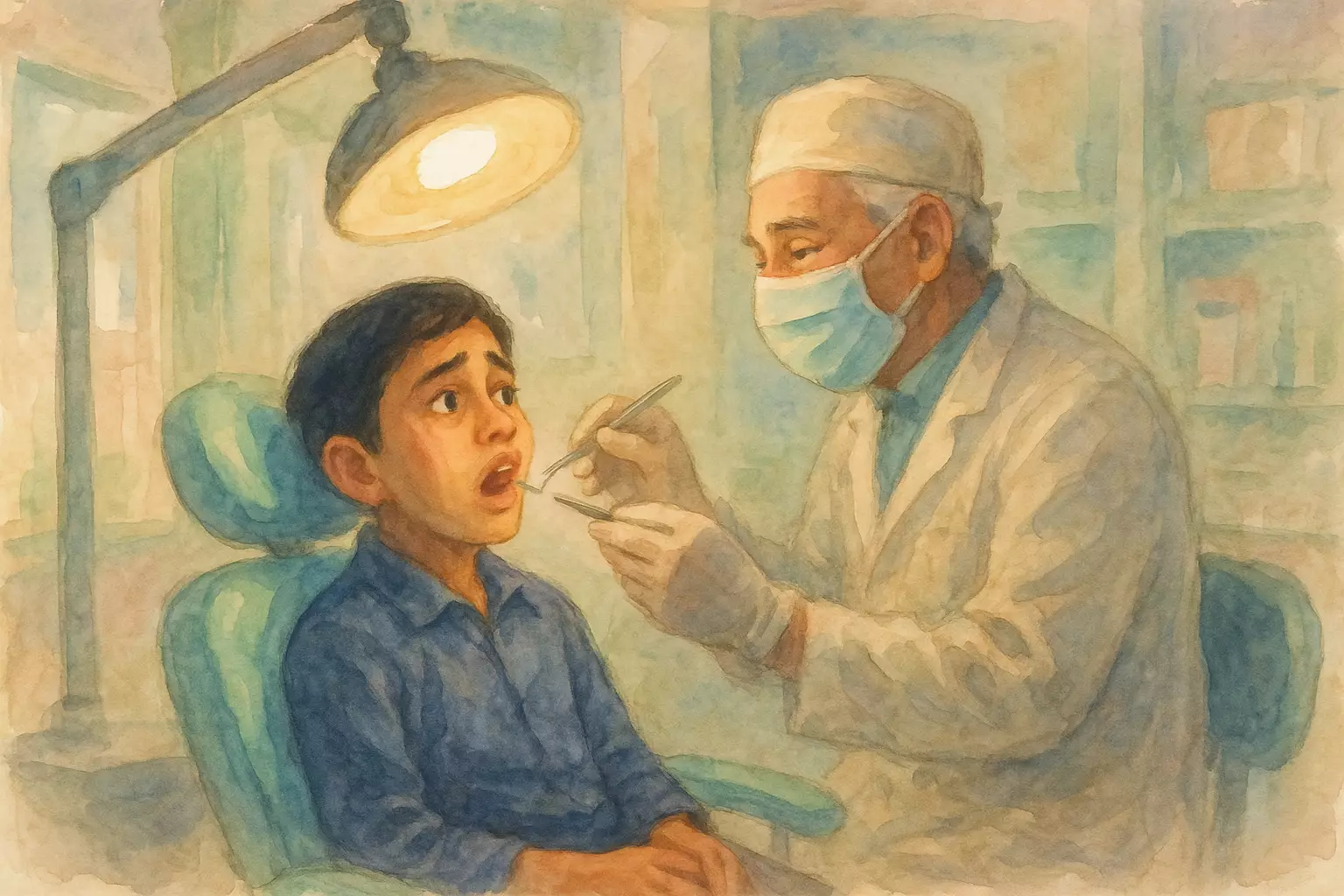 A Nepali student with a bad toothache visits a nearby dental clinic after his mother urges him to go. The dentist cleans and fills the tooth, gives simple advice, and the student leaves feeling relieved.