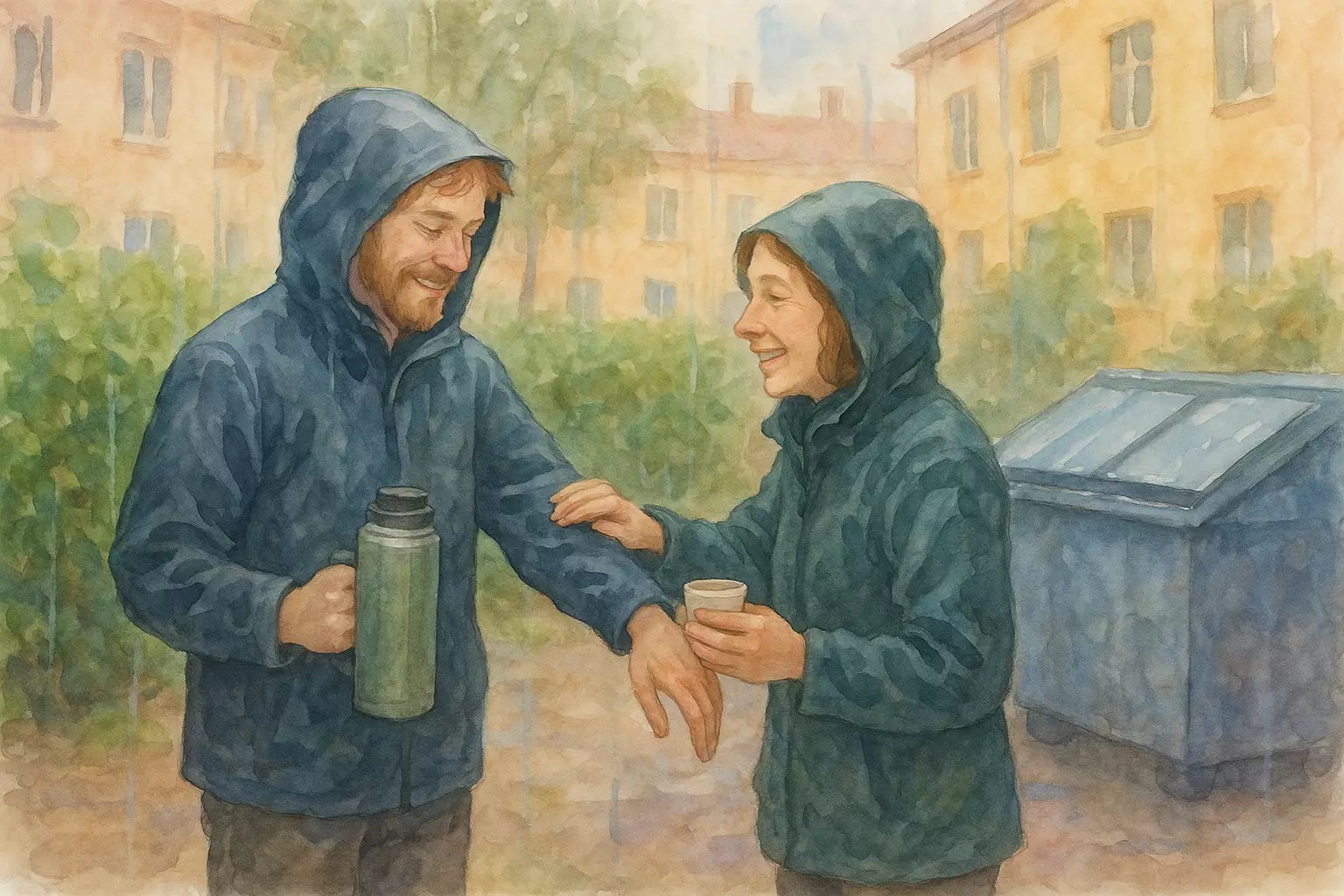 During a rainy spring dugnad in an Oslo apartment courtyard, a hesitant resident meets Amir, a new neighbor; after a rake mishap and shared coffee, they connect and plan future outings.