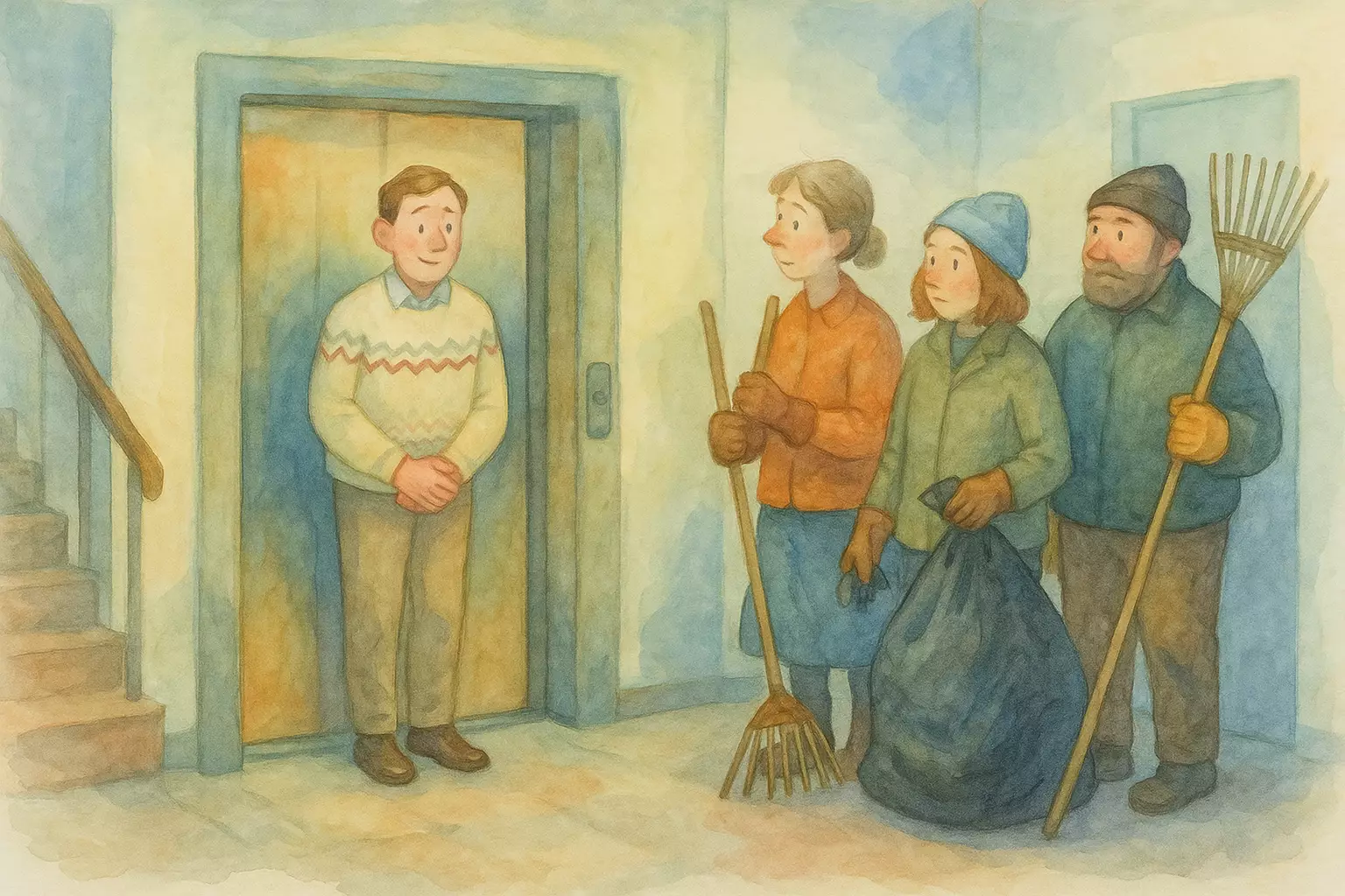 A newcomer in a Norwegian apartment building misreads a notice about a dugnad and arrives dressed for a party. Embarrassed, they make waffles while others clean, and everyone ends up laughing together.