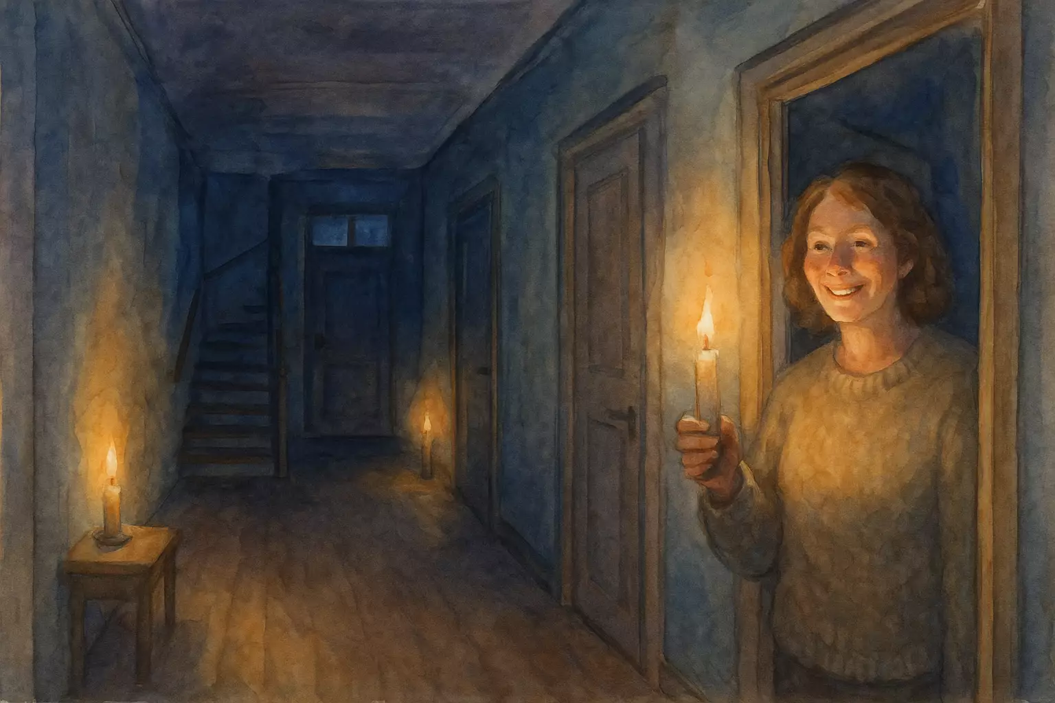 On a snowy evening in a Norwegian apartment building, a person and their neighbor Kari deal with a sudden power outage. They check the fuse box, call the power company, and wait by candlelight until the lights return.